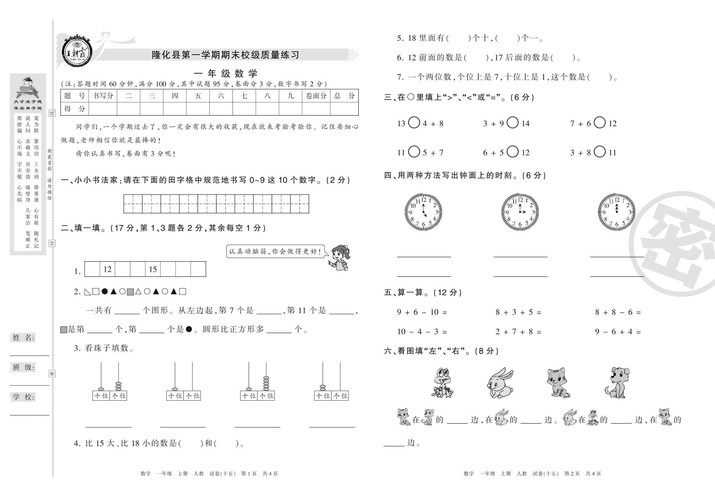 2016-2017学年第一学期承德市隆化县一年级数学试卷(人教版)【15】