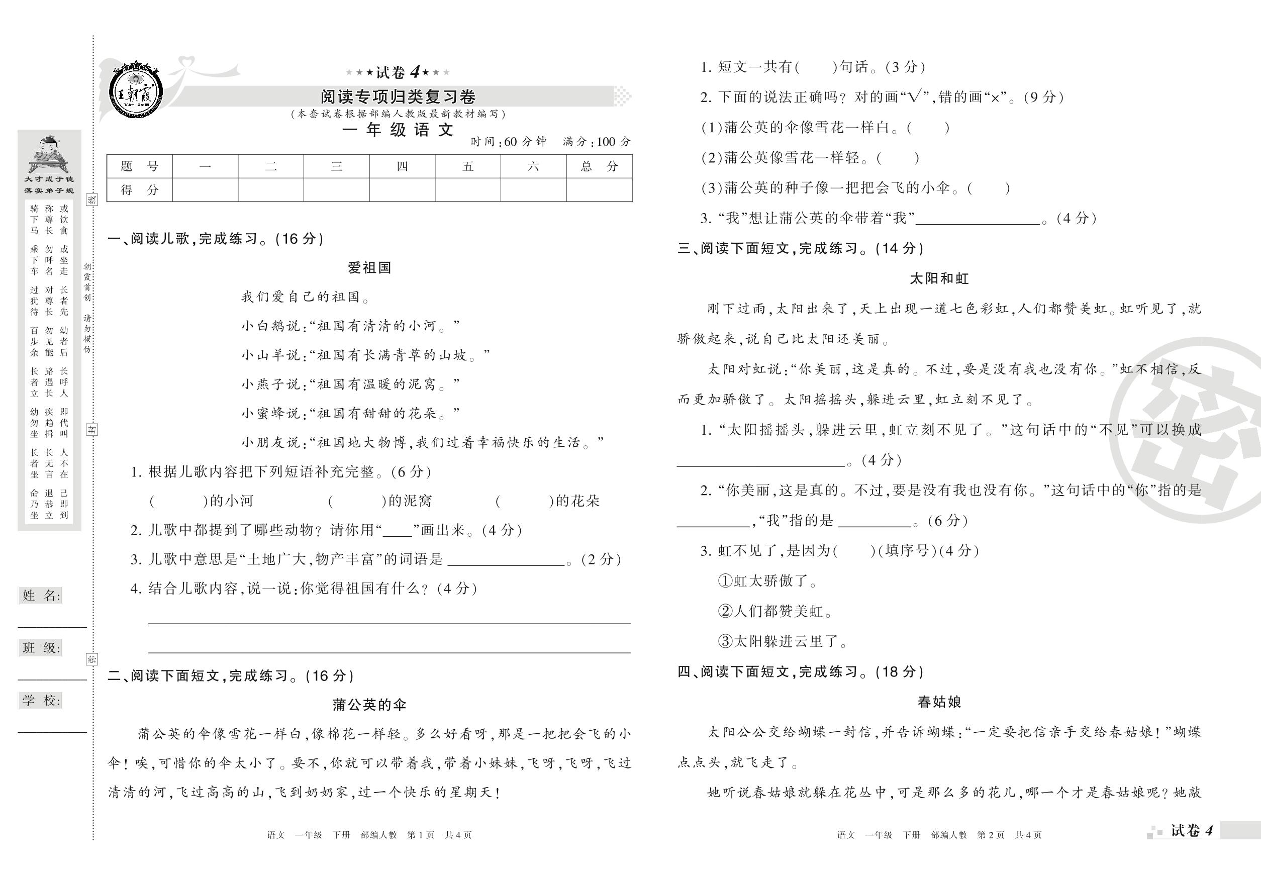 王朝霞期末专项卷——阅读专项归类复习卷一年级下册语文(人教版)_R210731190924【4】