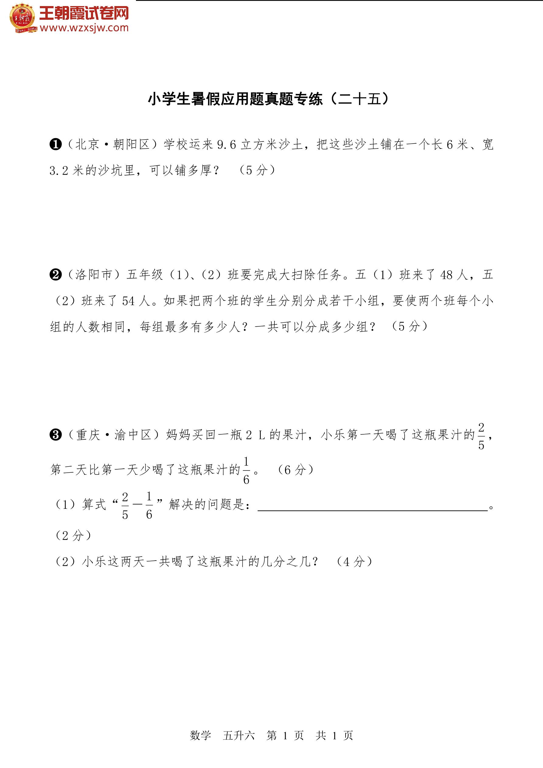 【五升六】小学生暑假数学应用题真题专练(二十五)