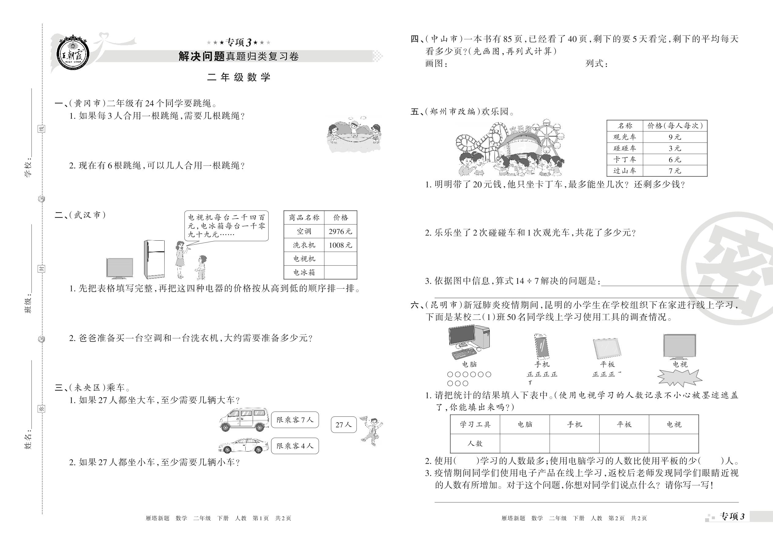王朝霞期末专项卷——解决问题真题归类复习、新颖题速递:生活与数学二年级下册数学(人教版)_R21080381908【0】