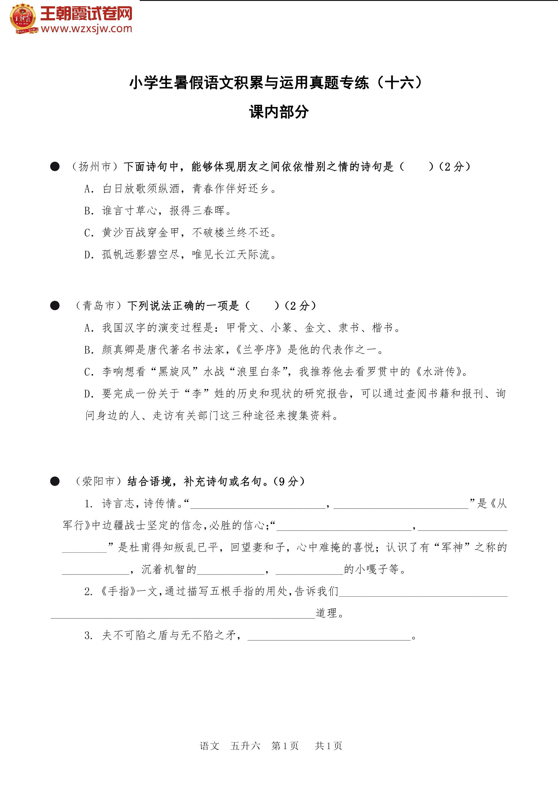 【五升六】小学生暑假语文积累与运用真题专练(十六)