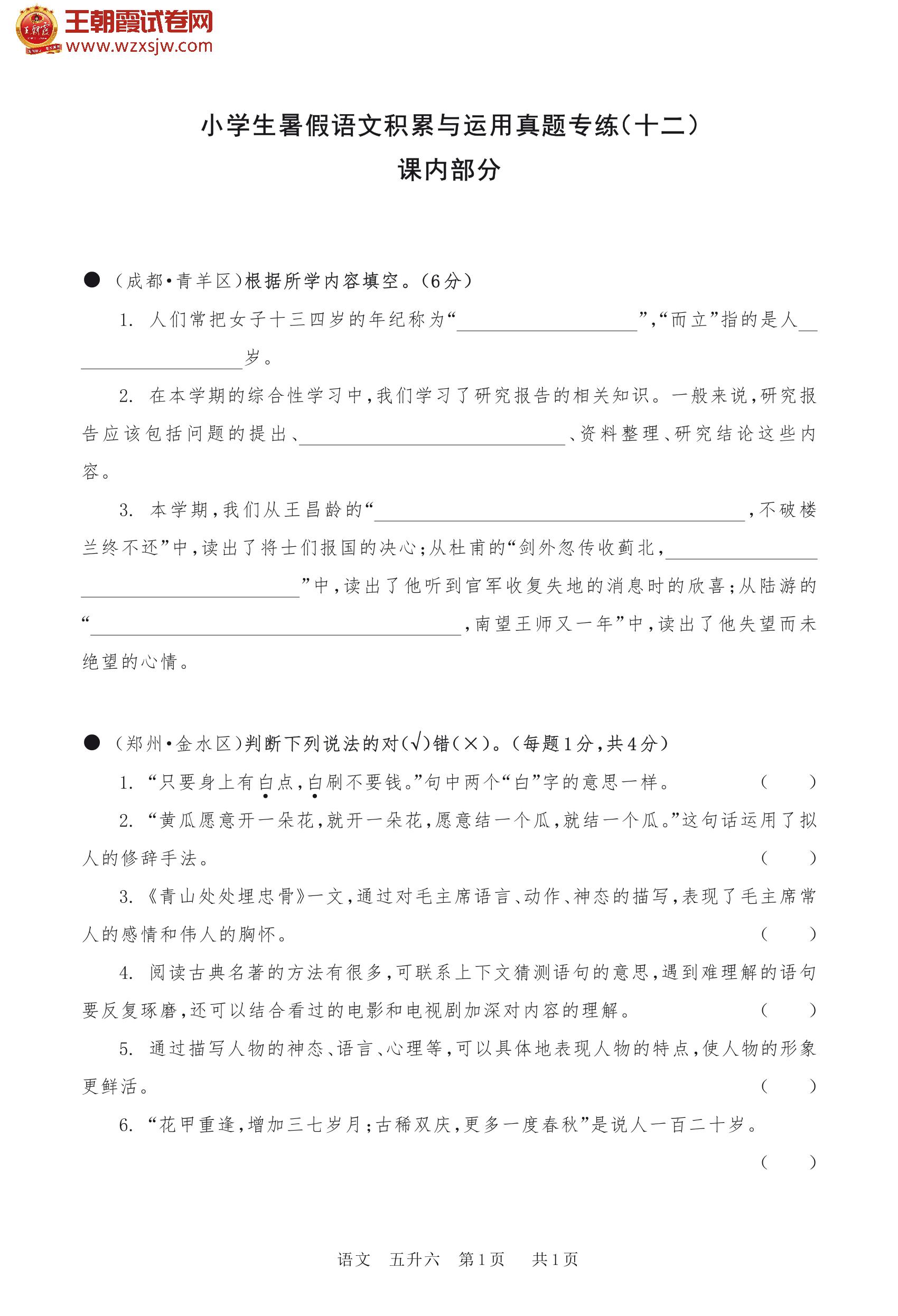 【五升六】小学生暑假语文积累与运用真题专练(十二)