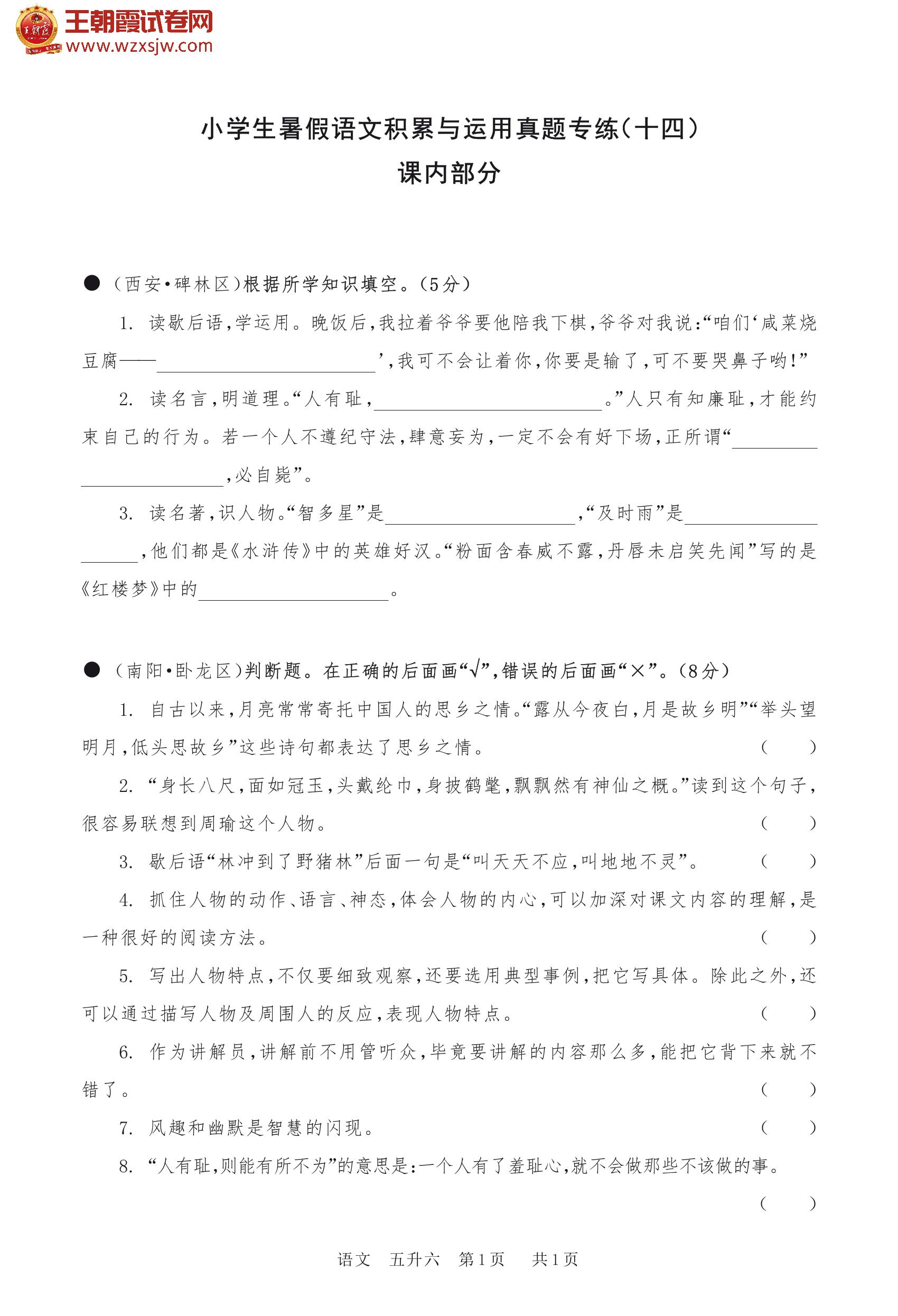 【五升六】小学生暑假语文积累与运用真题专练(十四)