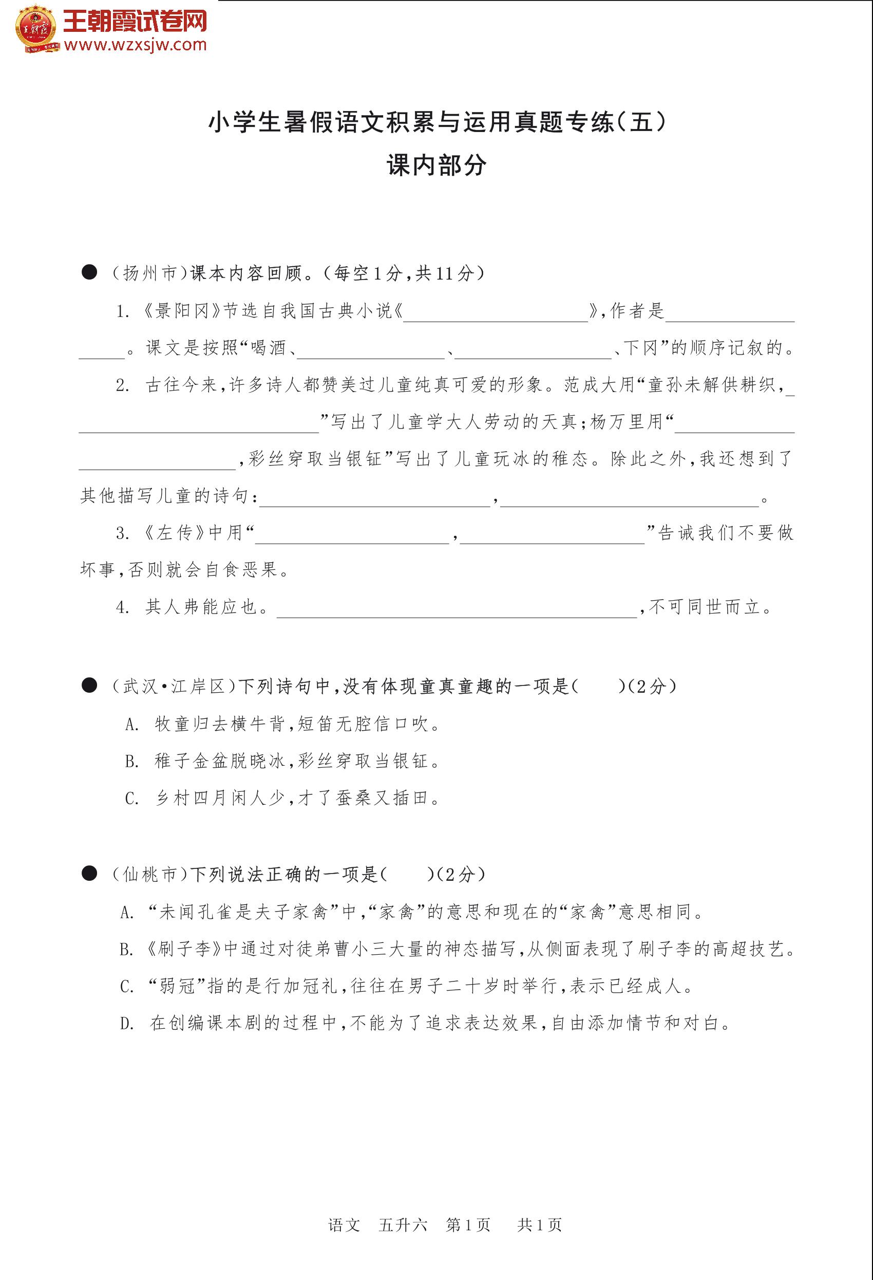 【五升六】小学生暑假语文积累与运用真题专练(五)