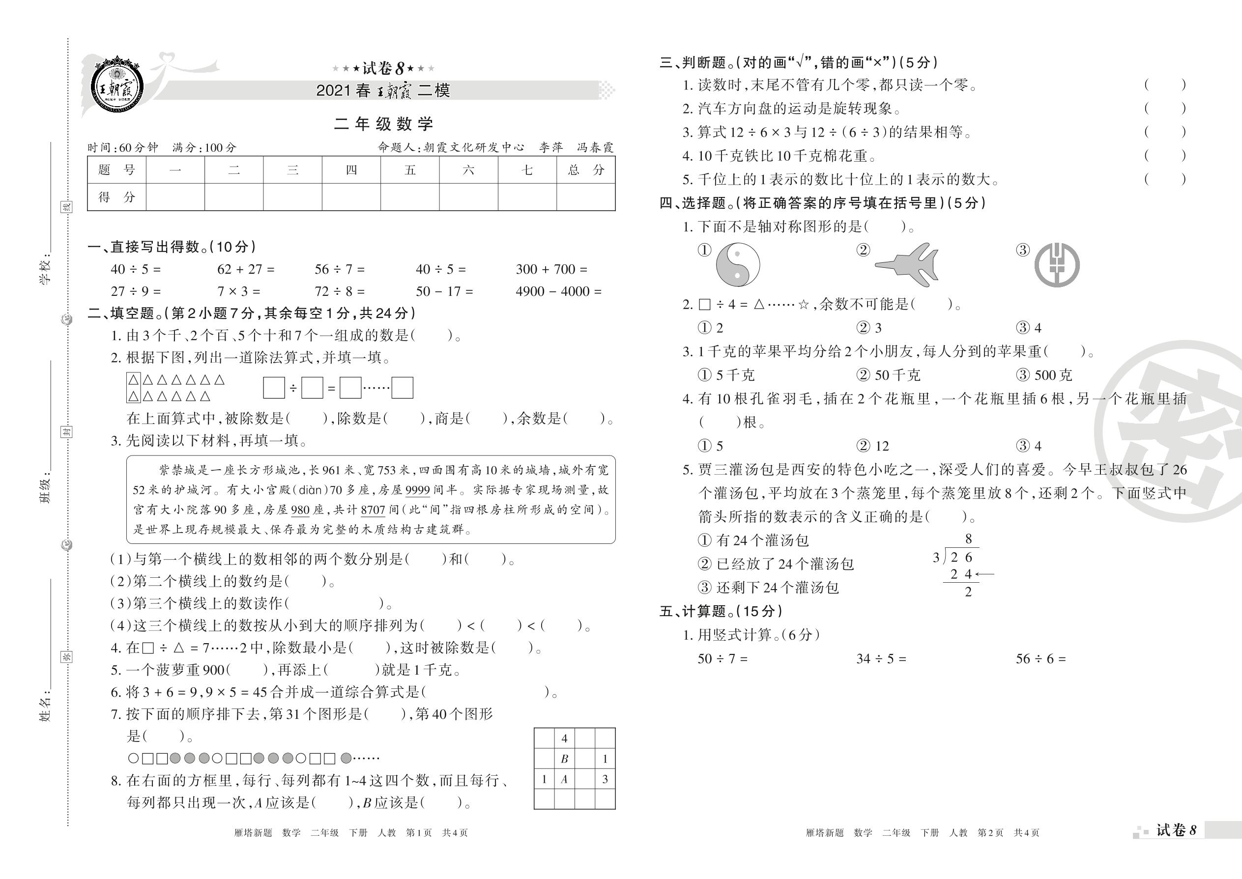 王朝霞期末模拟卷二年级下册数学(人教版)_R21080381935【8】