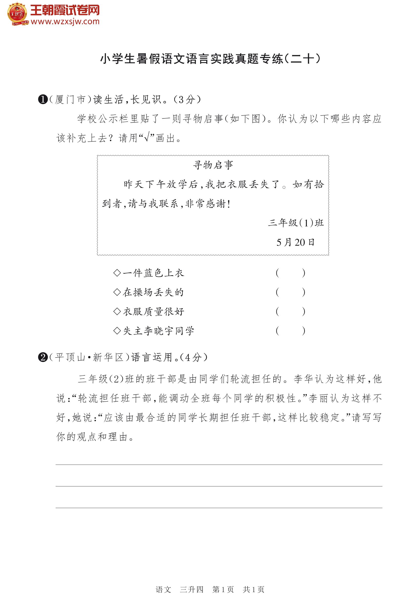 【三升四】小学生暑假语文语言实践真题专练(二十)