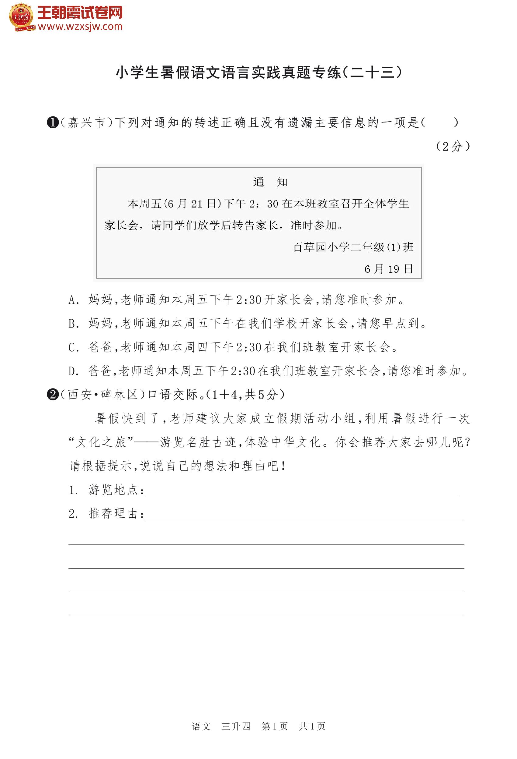 【三升四】小学生暑假语文语言实践真题专练(二十三)
