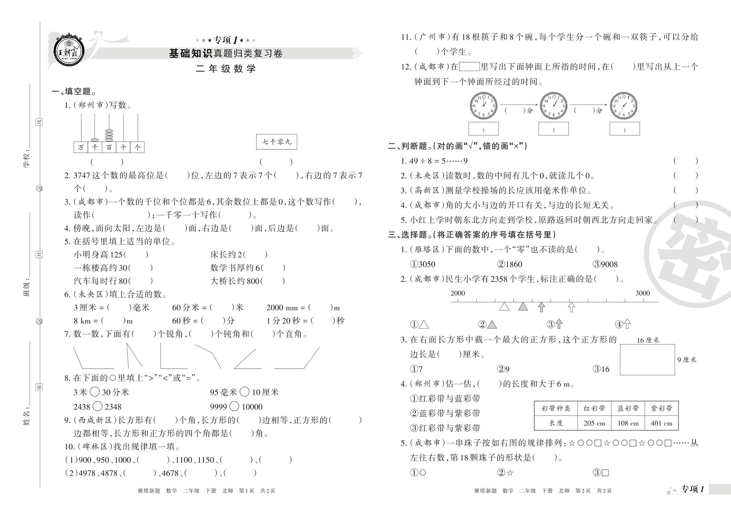 王朝霞期末专项卷——基础知识、计算真题归类复习二年级下册数学(北师版)_R21080381949【0】