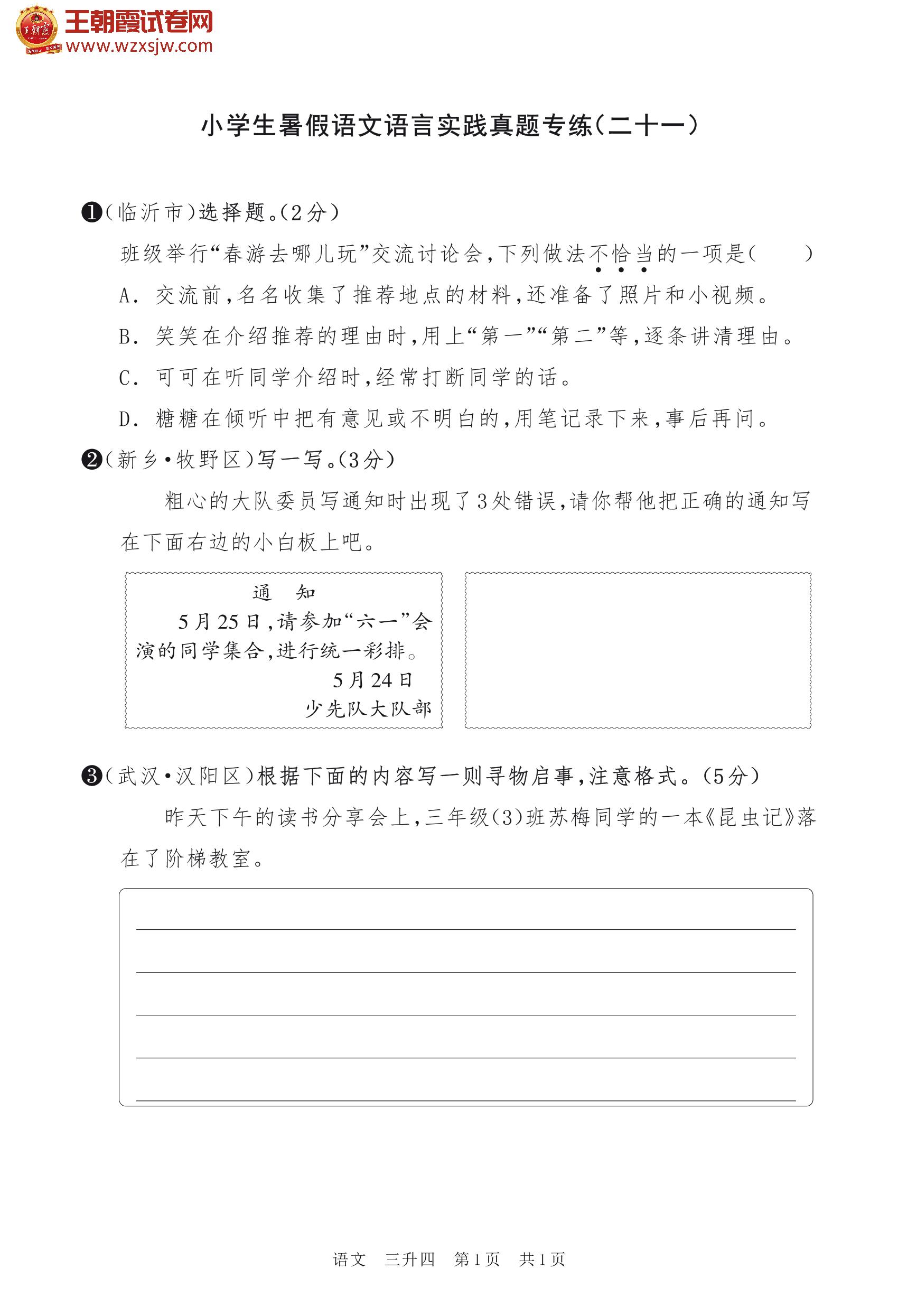 【三升四】小学生暑假语文语言实践真题专练(二十一)