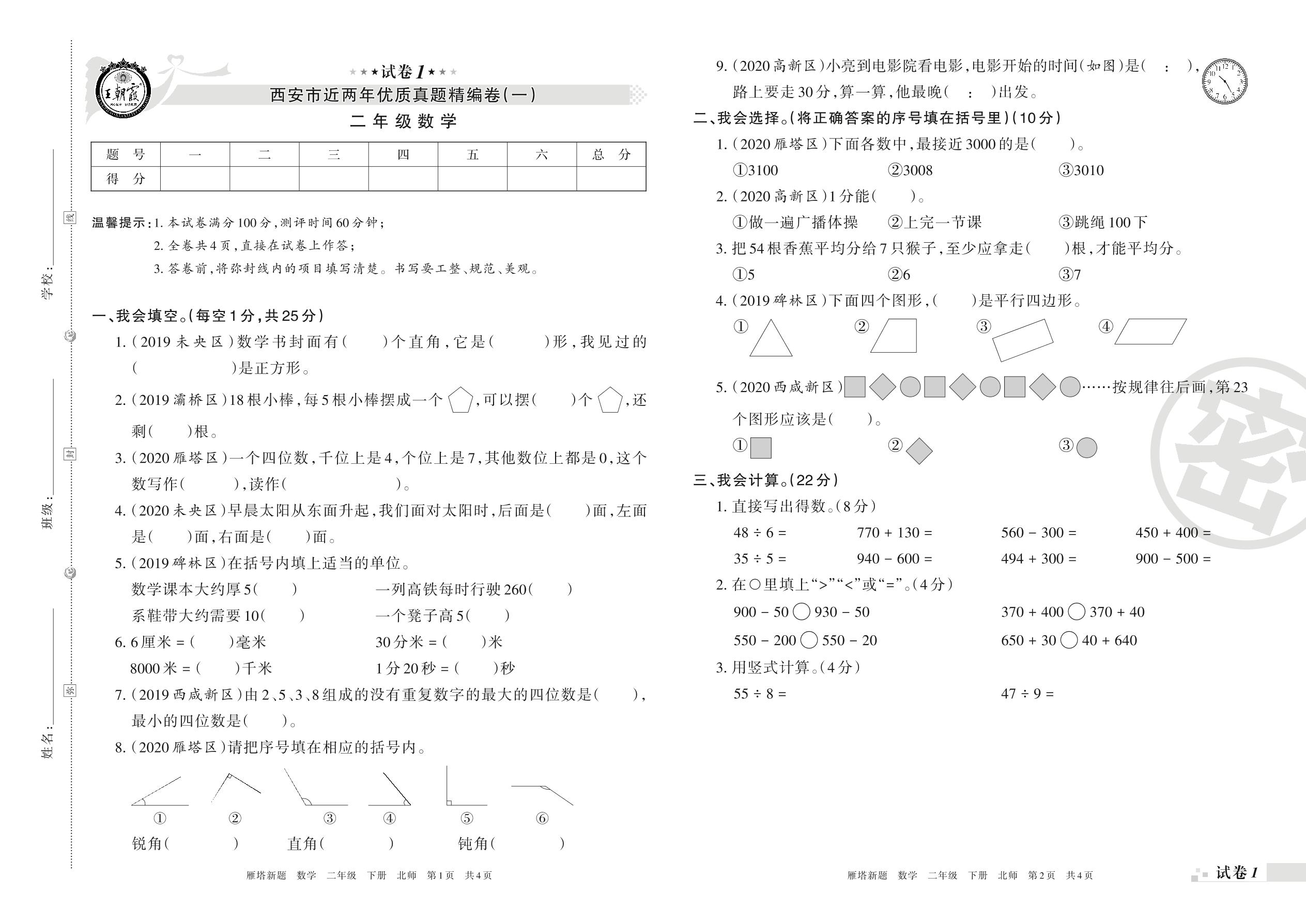 优质试题精编卷(一)二年级下册数学(北师版)【1】