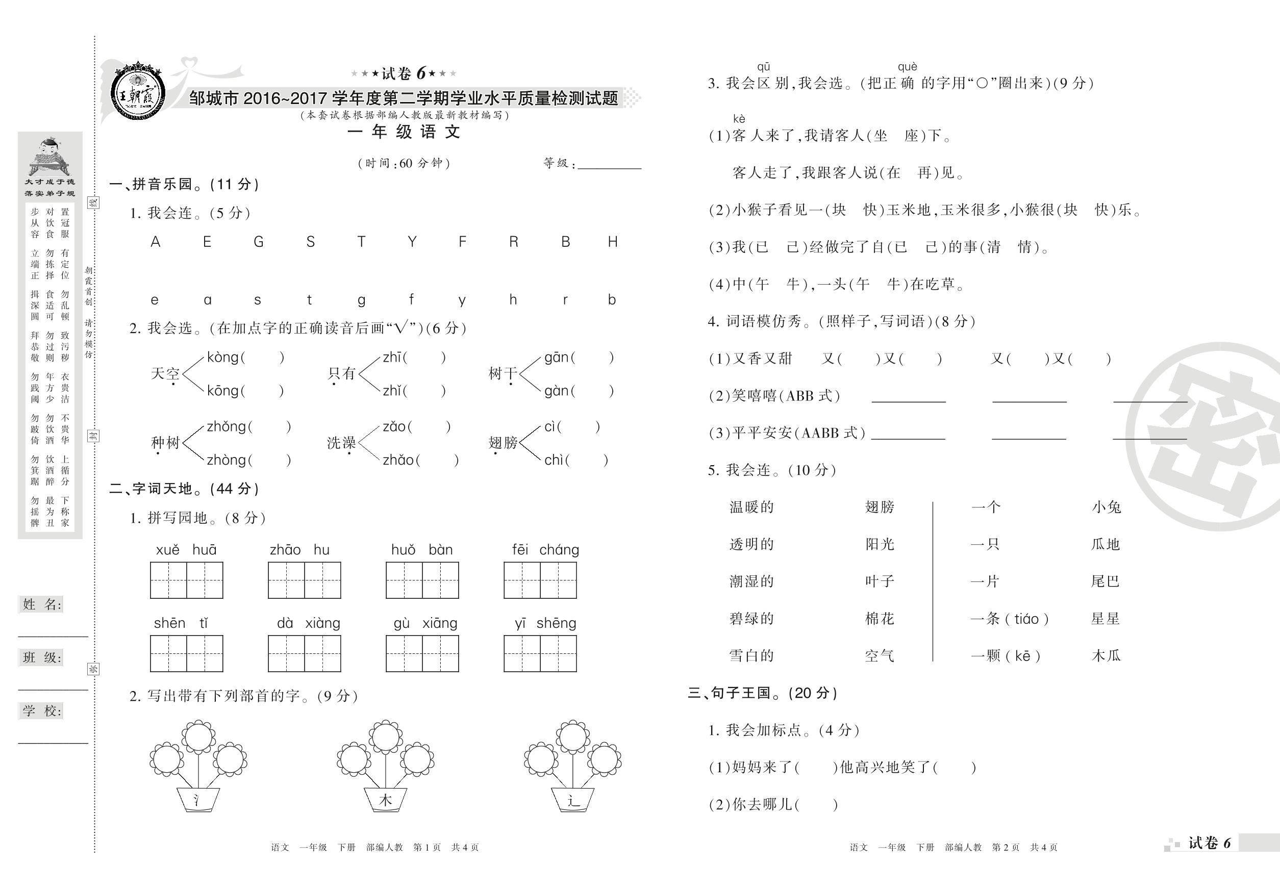 2016-2017学年第二学期邹城市一年级语文试卷(人教版)【6】