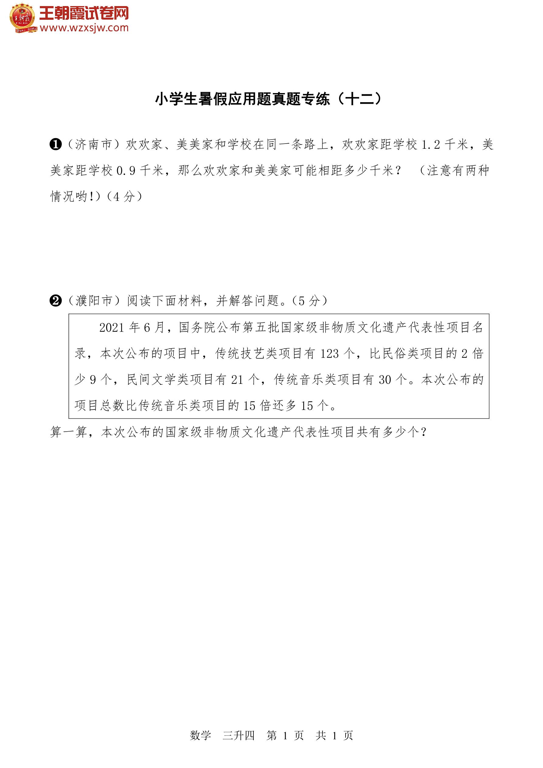 【三升四】小学生暑假数学应用题真题专练(十二)