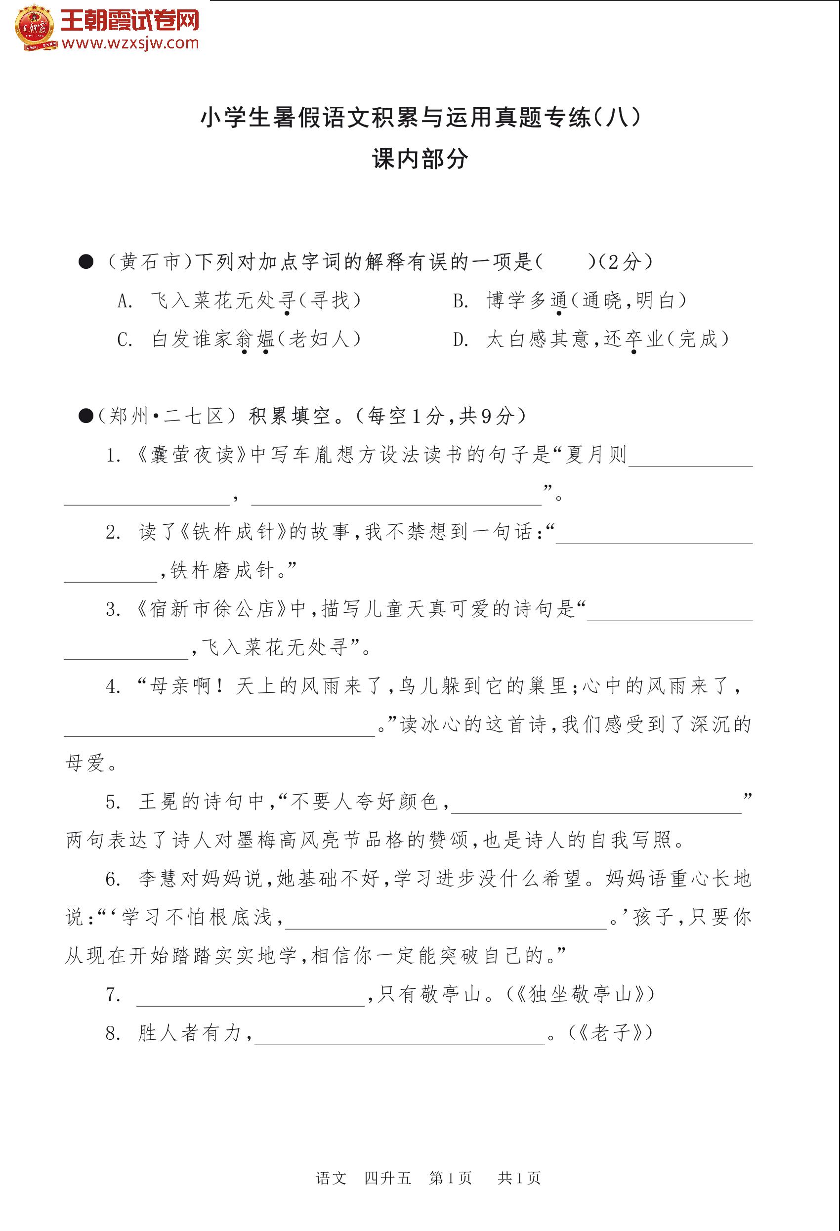 【四升五】小学生暑假语文积累与运用真题专练(八)