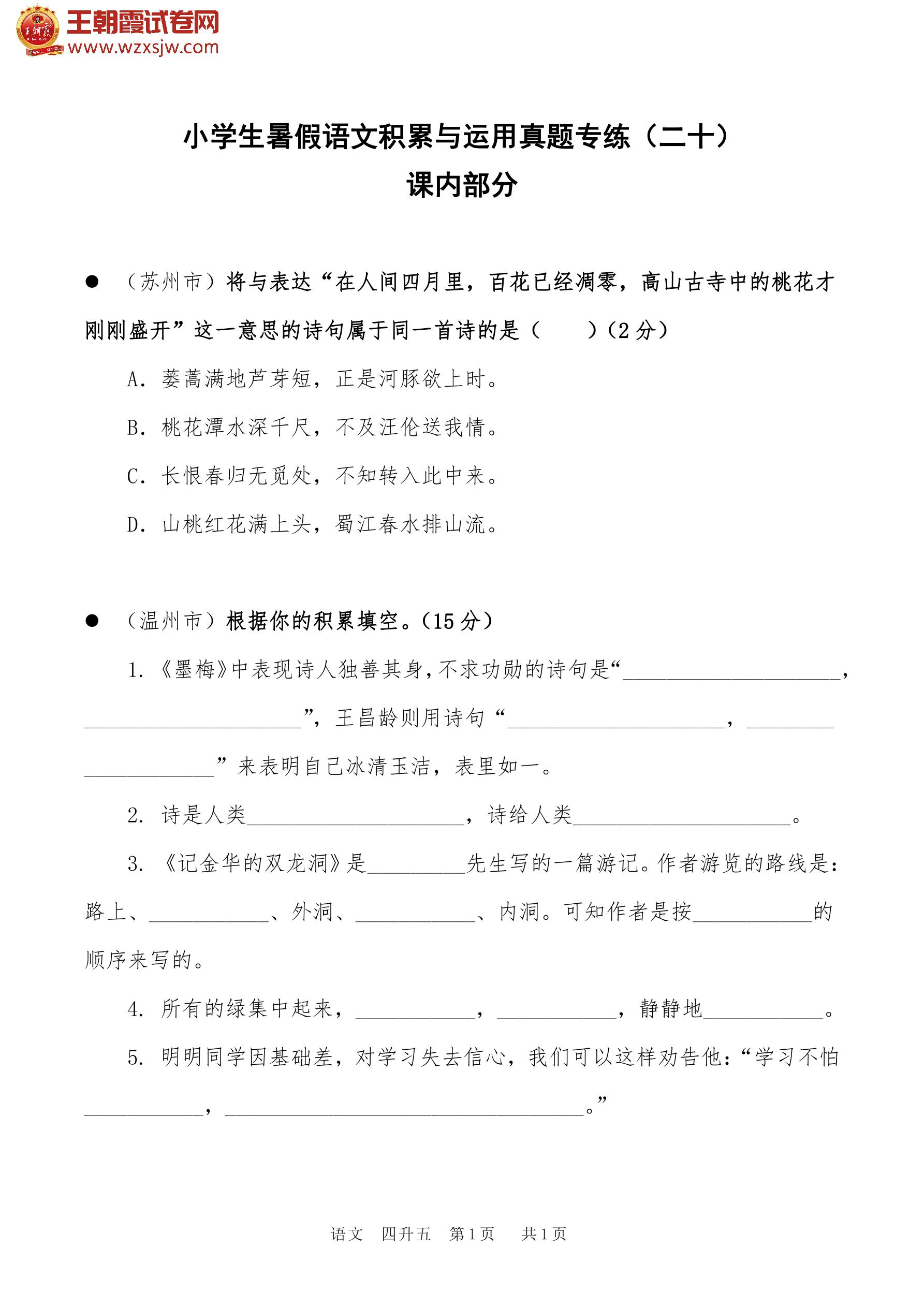 【四升五】小学生暑假语文积累与运用真题专练(二十)