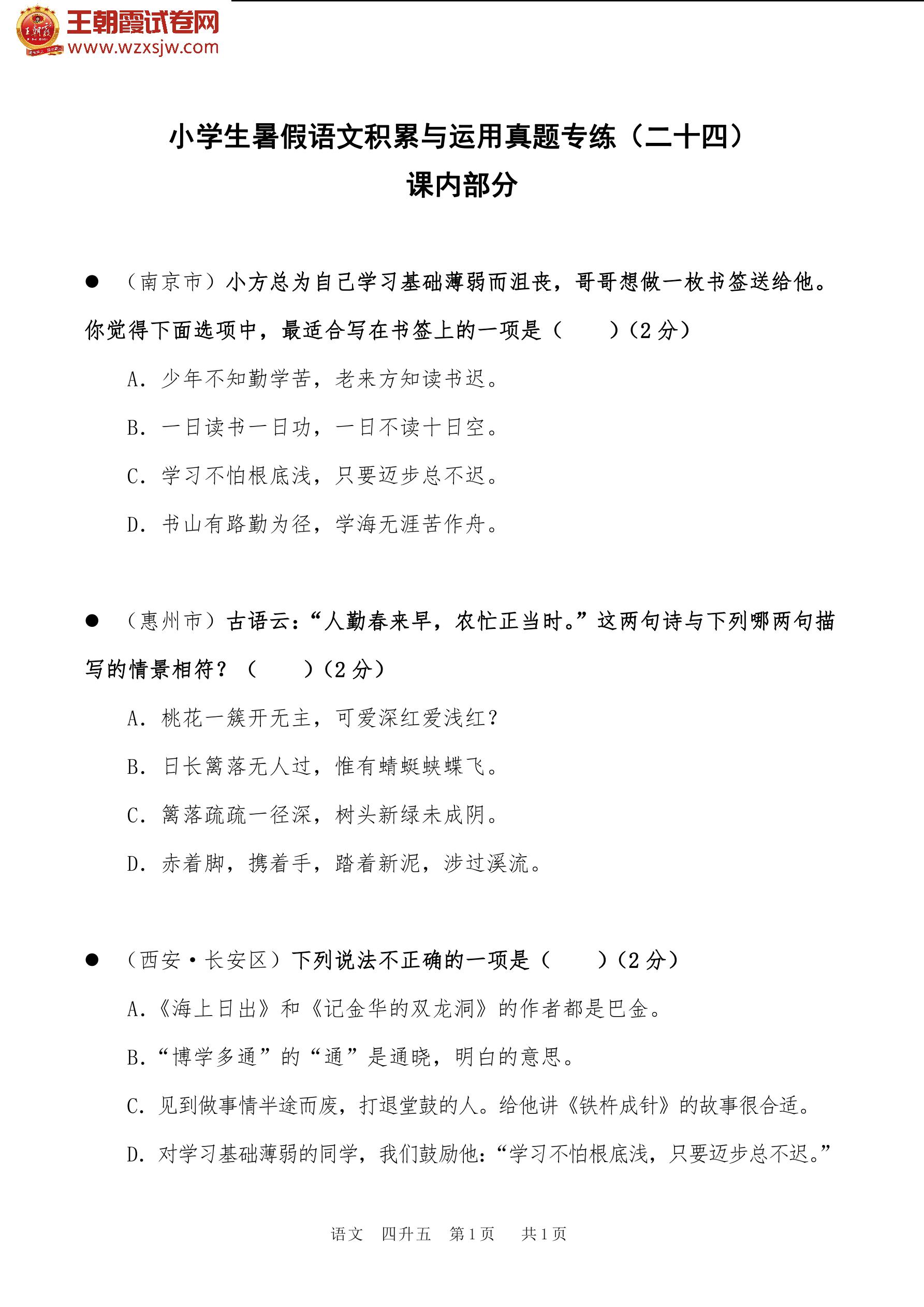 【四升五】小学生暑假语文积累与运用真题专练(二十四)