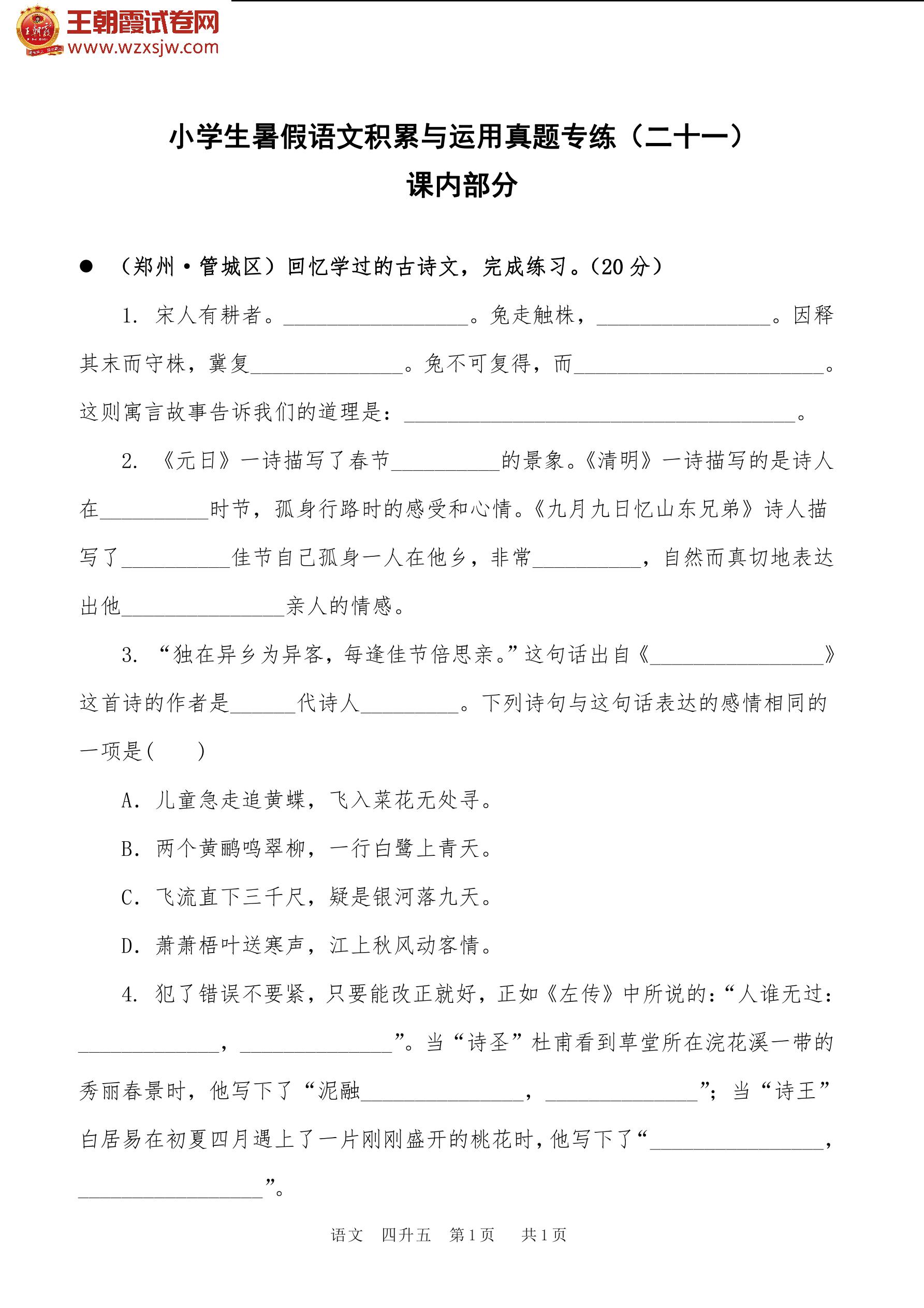 【四升五】小学生暑假语文积累与运用真题专练(二十一)