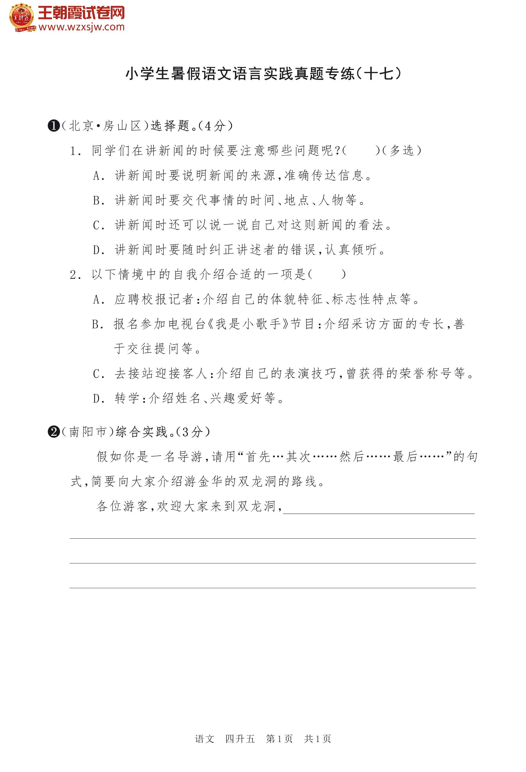 【四升五】小学生暑假语文语言实践真题专练(十七)
