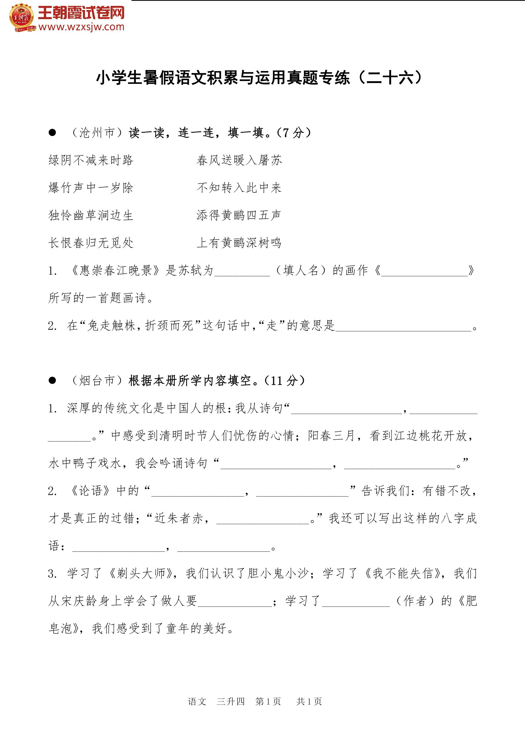 【三升四】小学生暑假语文积累与运用真题专练(二十六)