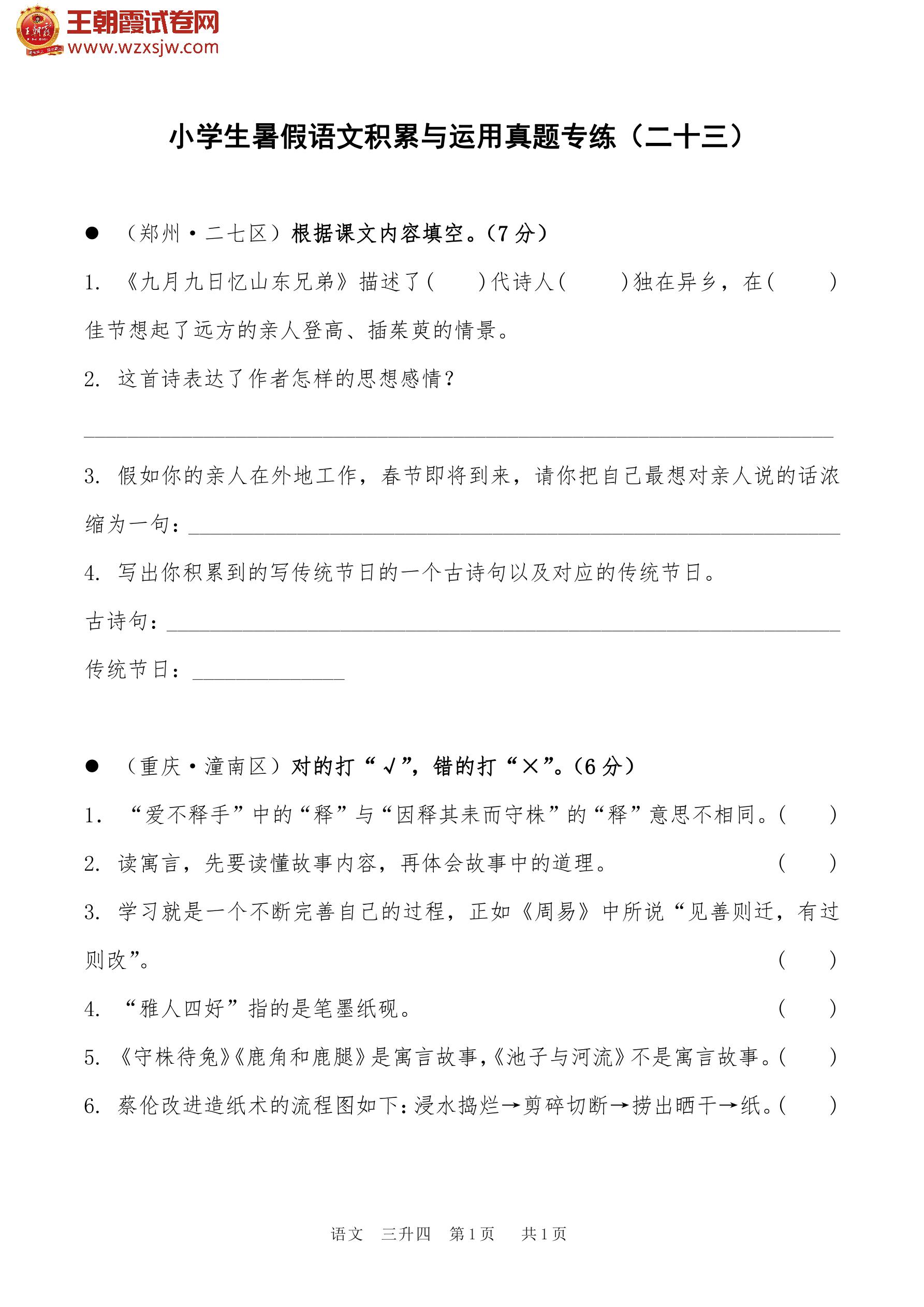 【三升四】小学生暑假语文积累与运用真题专练(二十三)