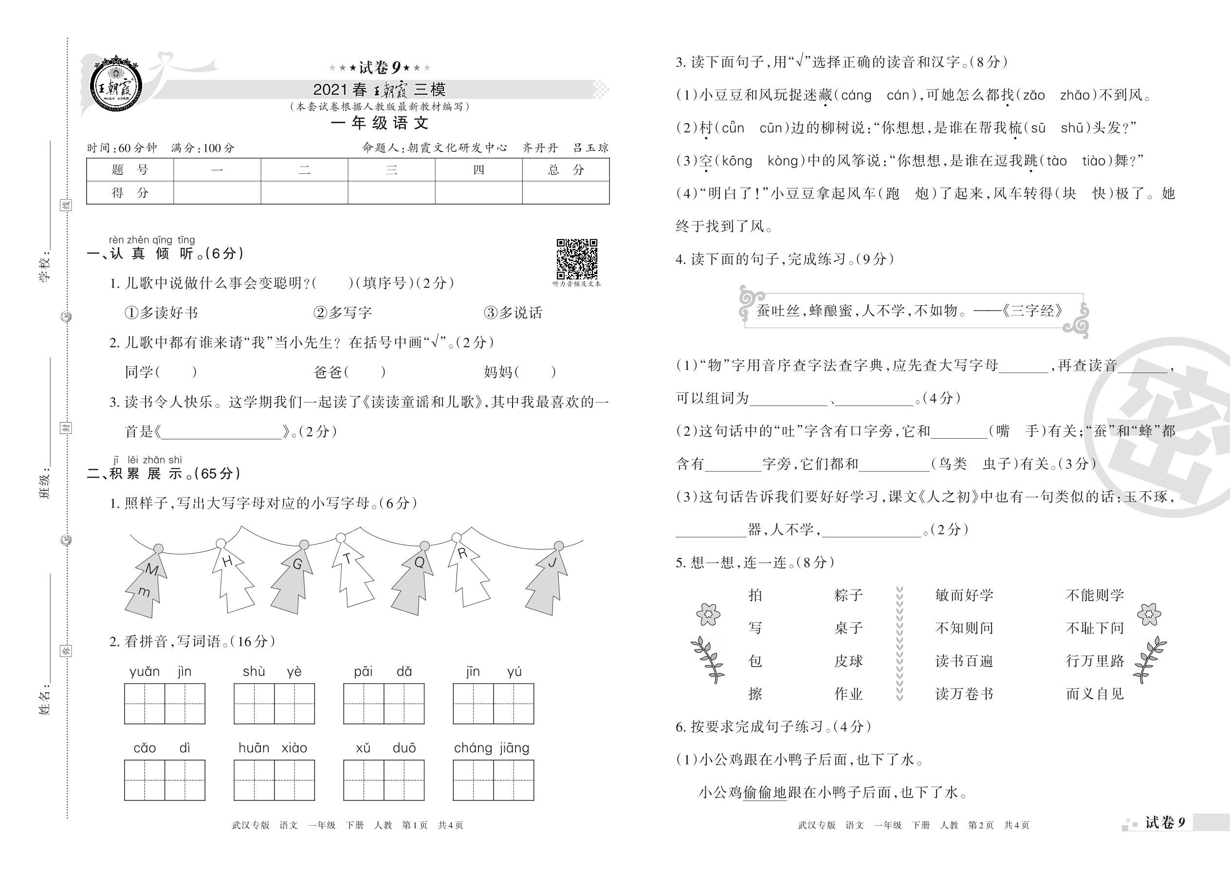 王朝霞期末模拟卷一年级下册语文(人教版)_R210731173521【9】