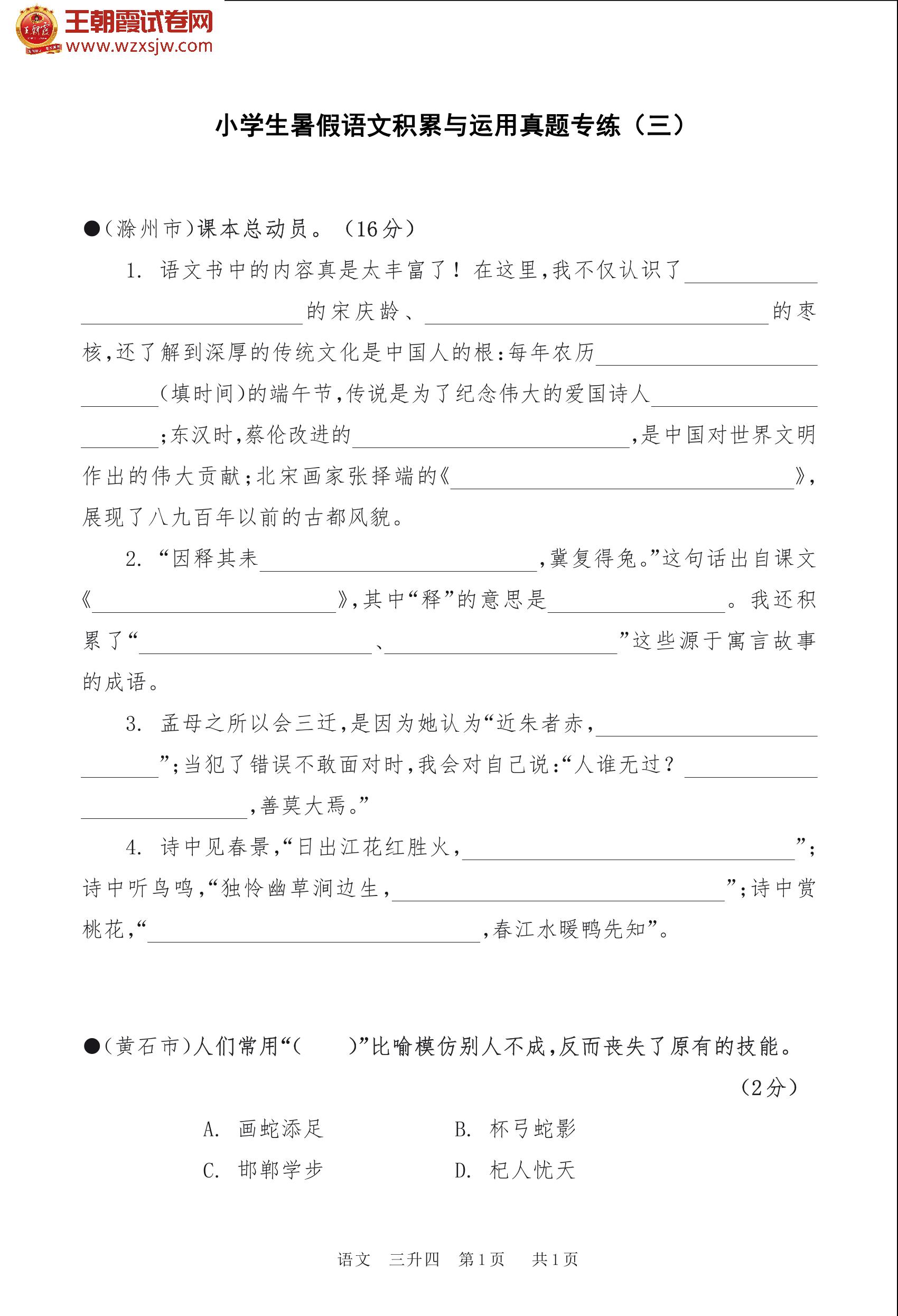 【三升四】小学生暑假语文积累与运用真题专练(三)