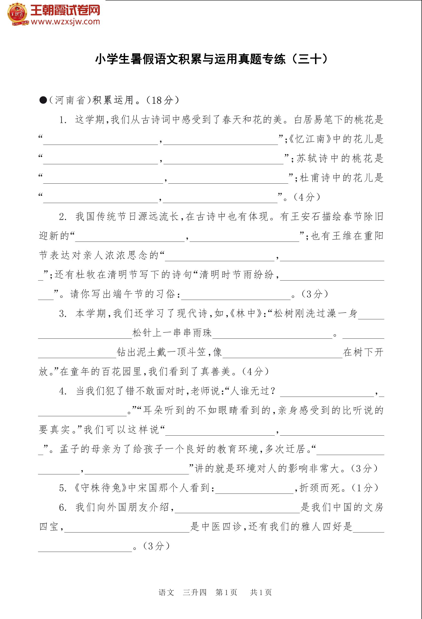 【三升四】小学生暑假语文积累与运用真题专练(三十)