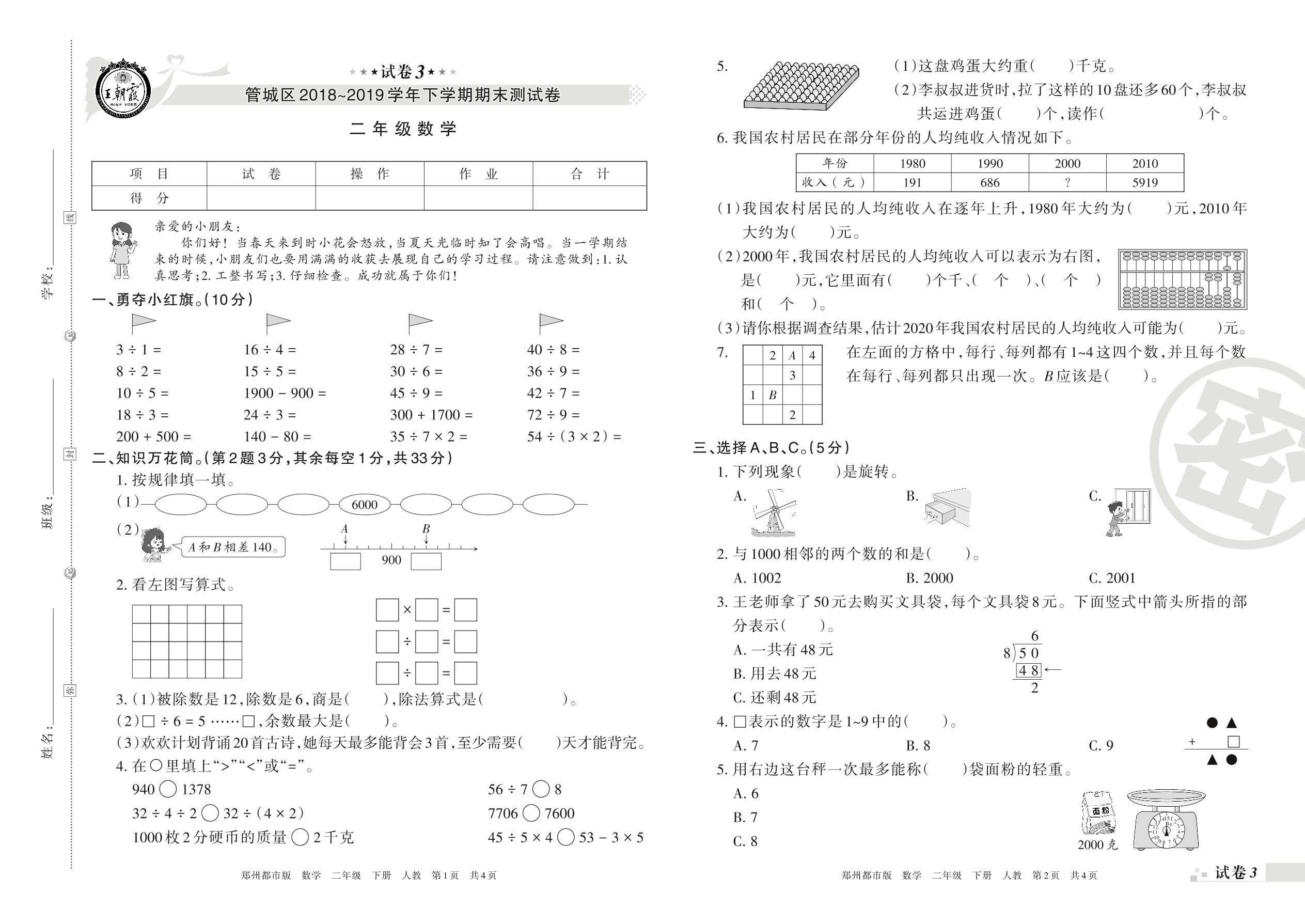 2018-2019学年第二学期郑州市管城区二年级数学试卷(人教版)【3】