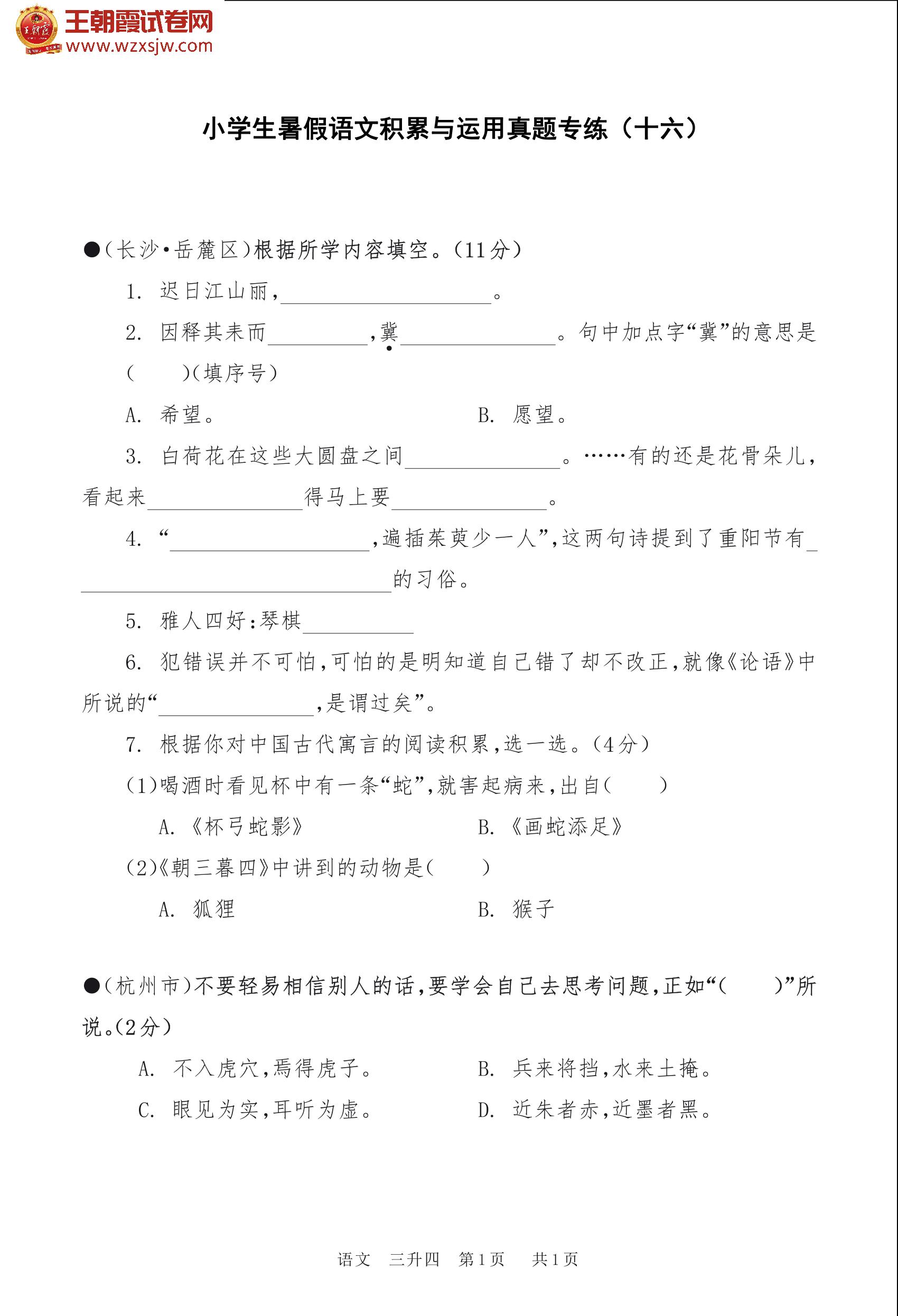 【三升四】小学生暑假语文积累与运用真题专练(十六)
