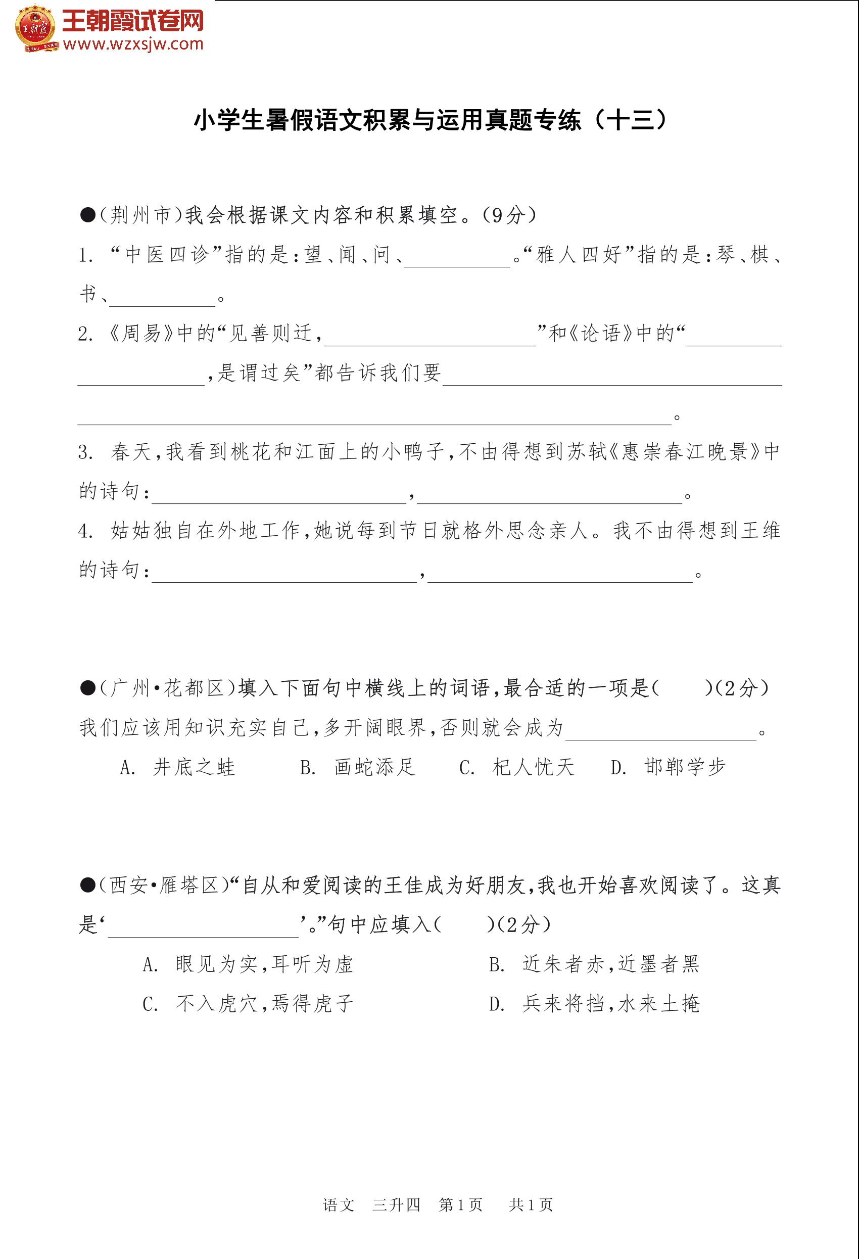 【三升四】小学生暑假语文积累与运用真题专练(十三)