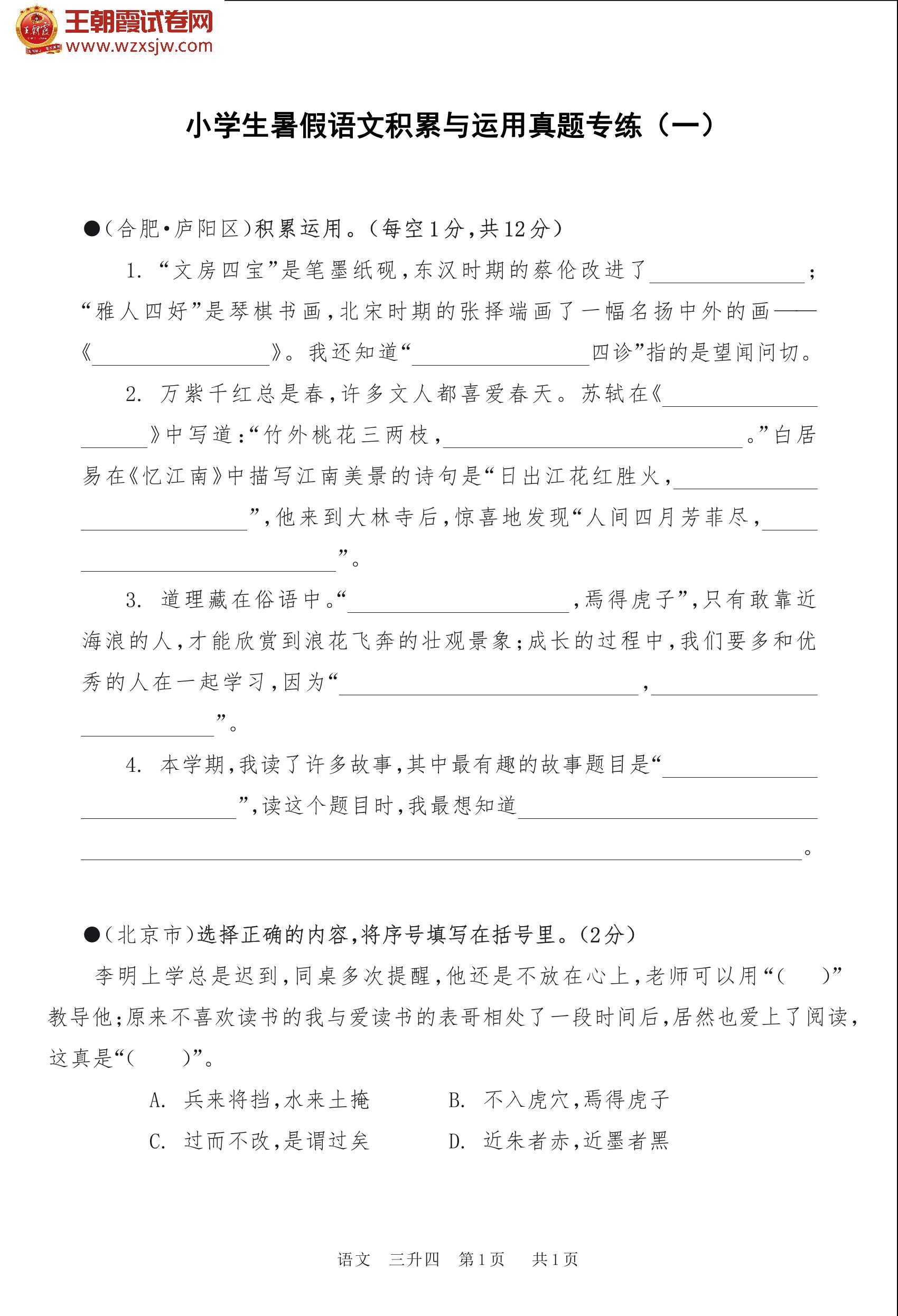【三升四】小学生暑假语文积累与运用真题专练(一)
