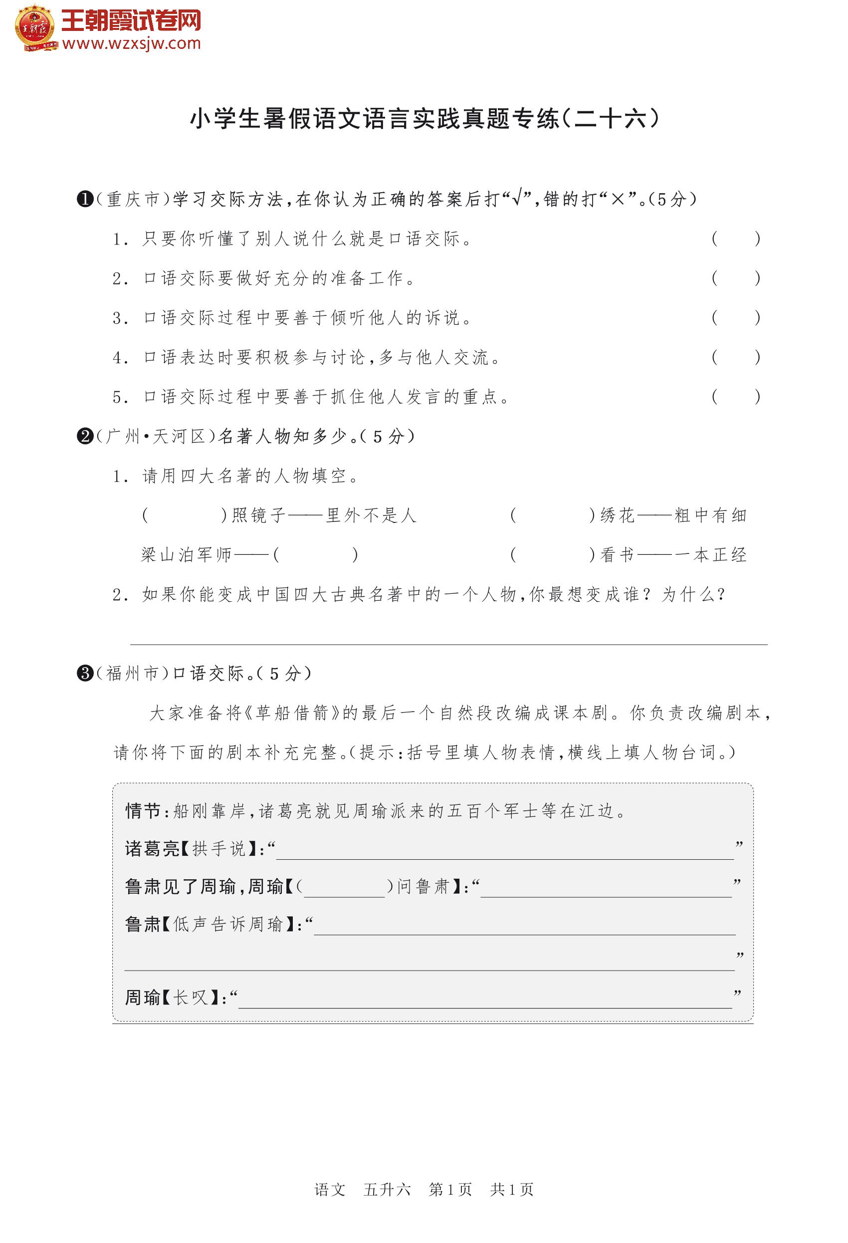 【五升六】小学生暑假语文语言实践真题专练(二十六)