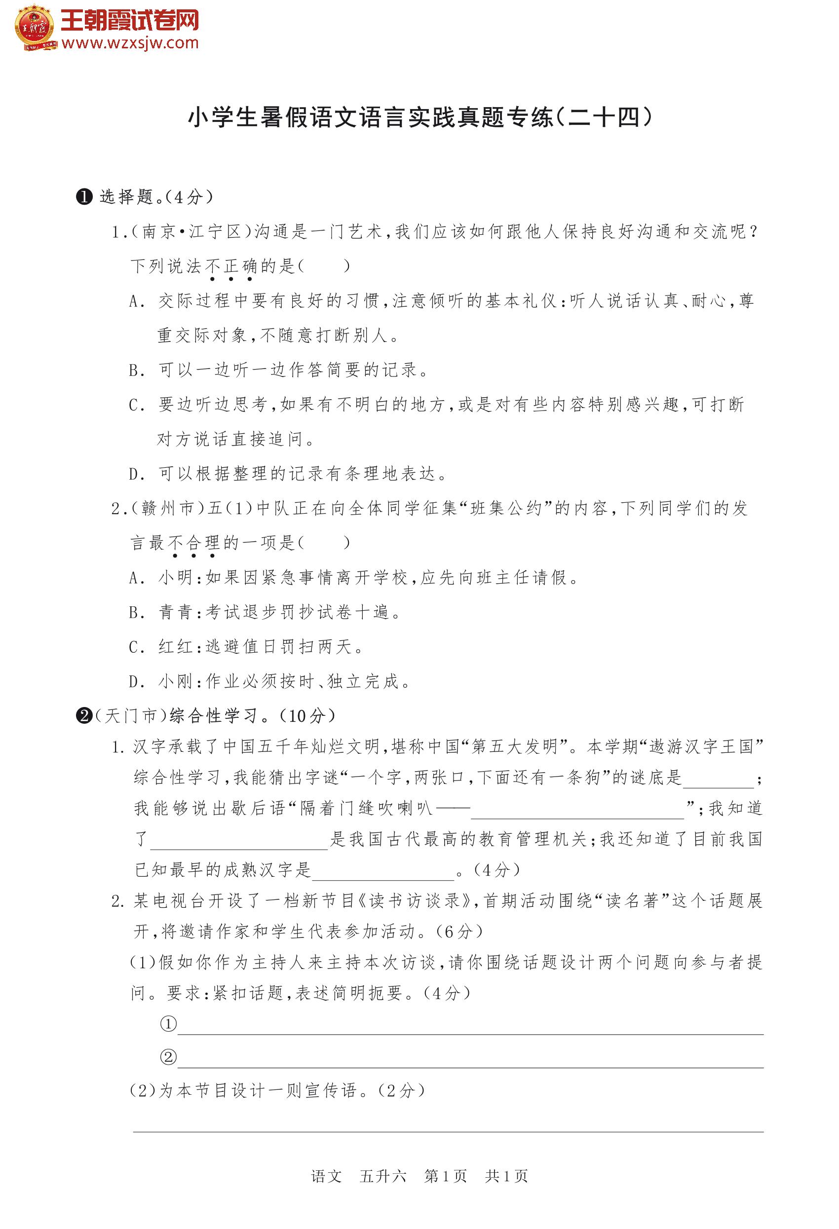 【五升六】小学生暑假语文语言实践真题专练(二十四)
