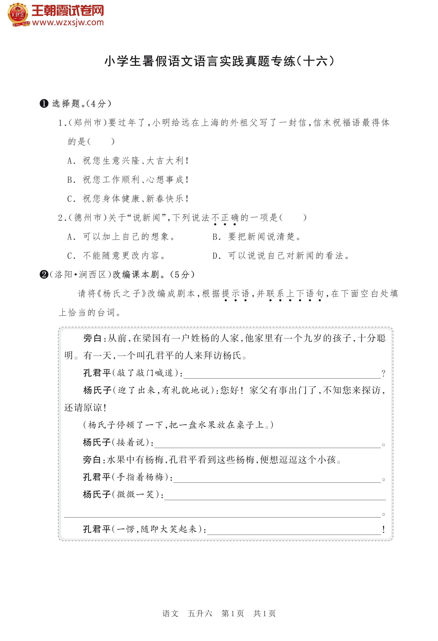 【五升六】小学生暑假语文语言实践真题专练(十六)