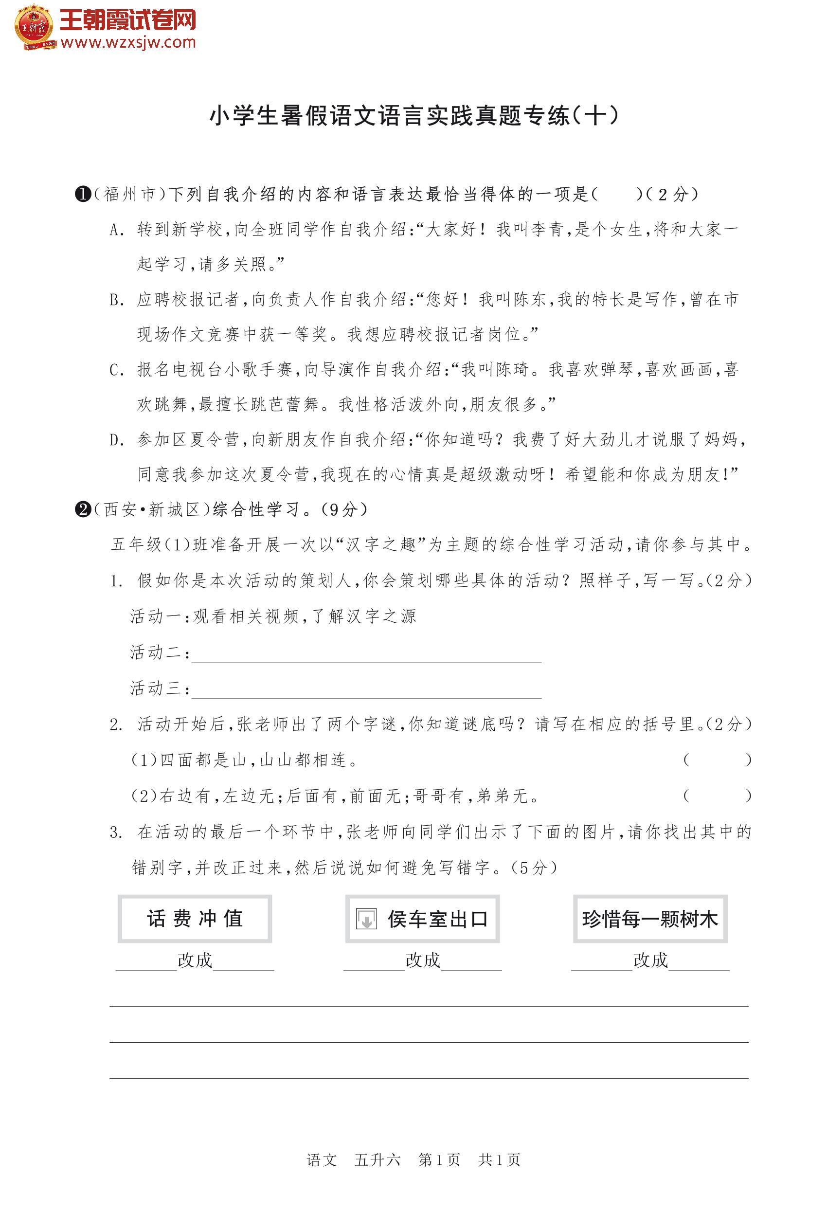 【五升六】小学生暑假语文语言实践真题专练(十)