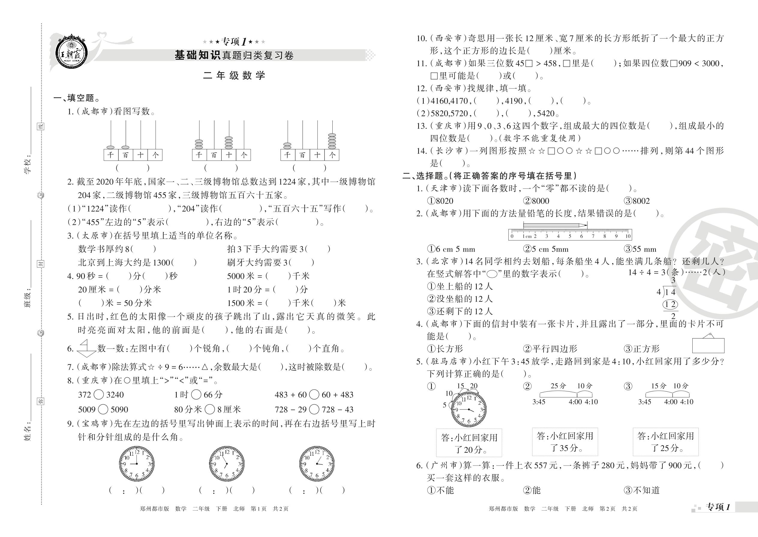 王朝霞期末专项卷——基础知识、计算真题归类复习二年级下册数学(北师版)_R21080382159【0】