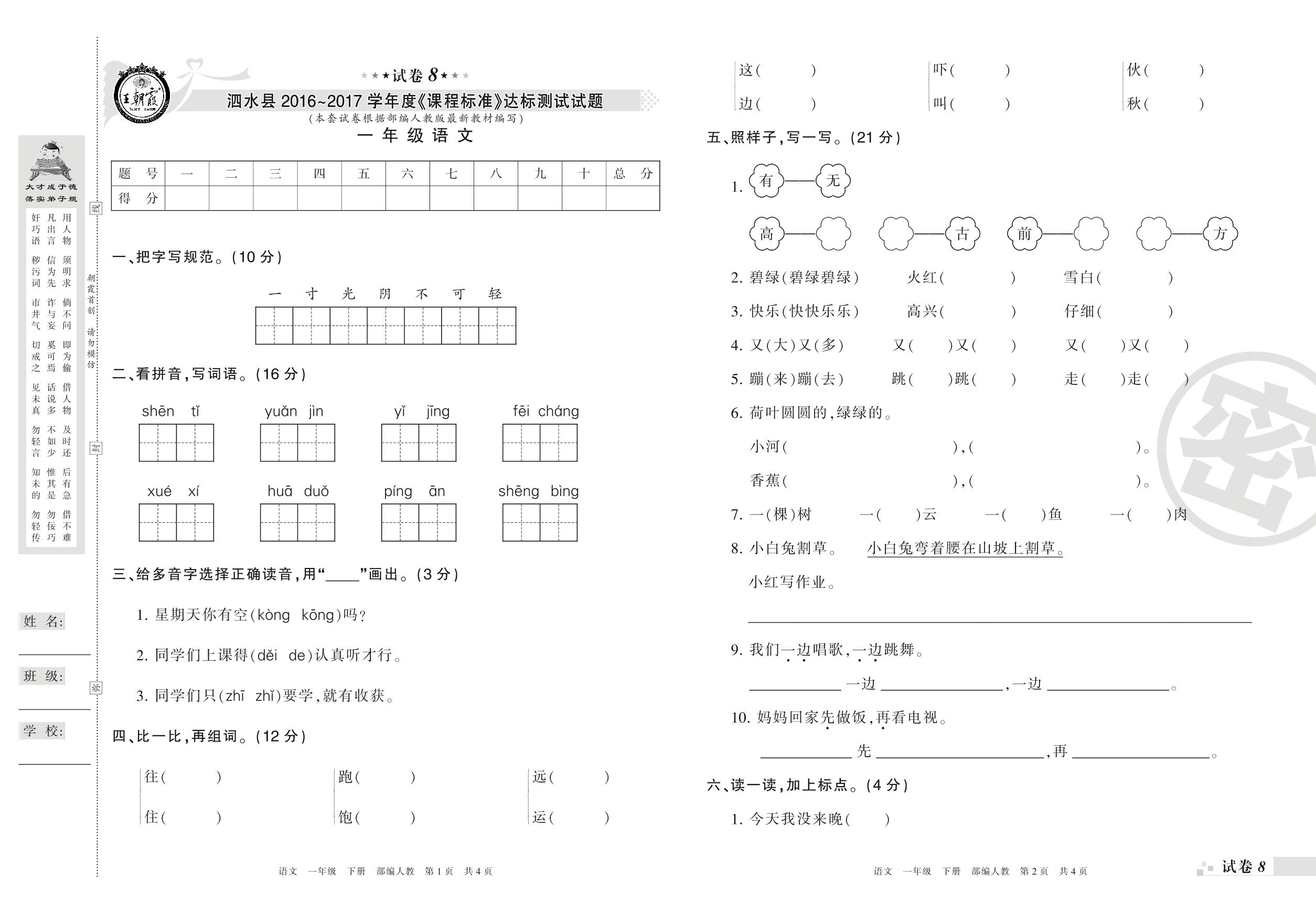 2016-2017学年第二学期济宁市泗水县一年级语文试卷(人教版)【8】