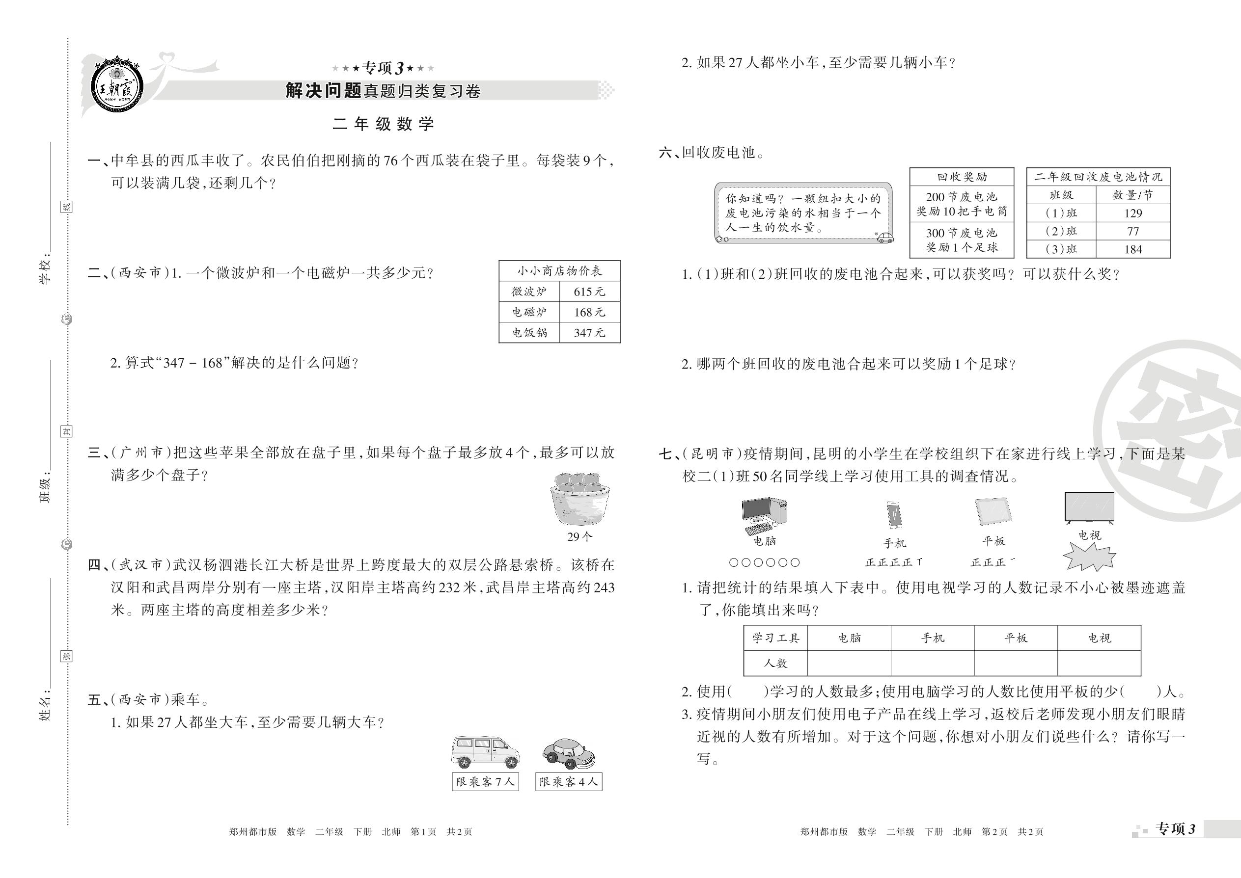 王朝霞期末专项卷——解决问题真题归类复习、新颖题速递:生活与数学二年级下册数学(北师版)_R21080382204【0】