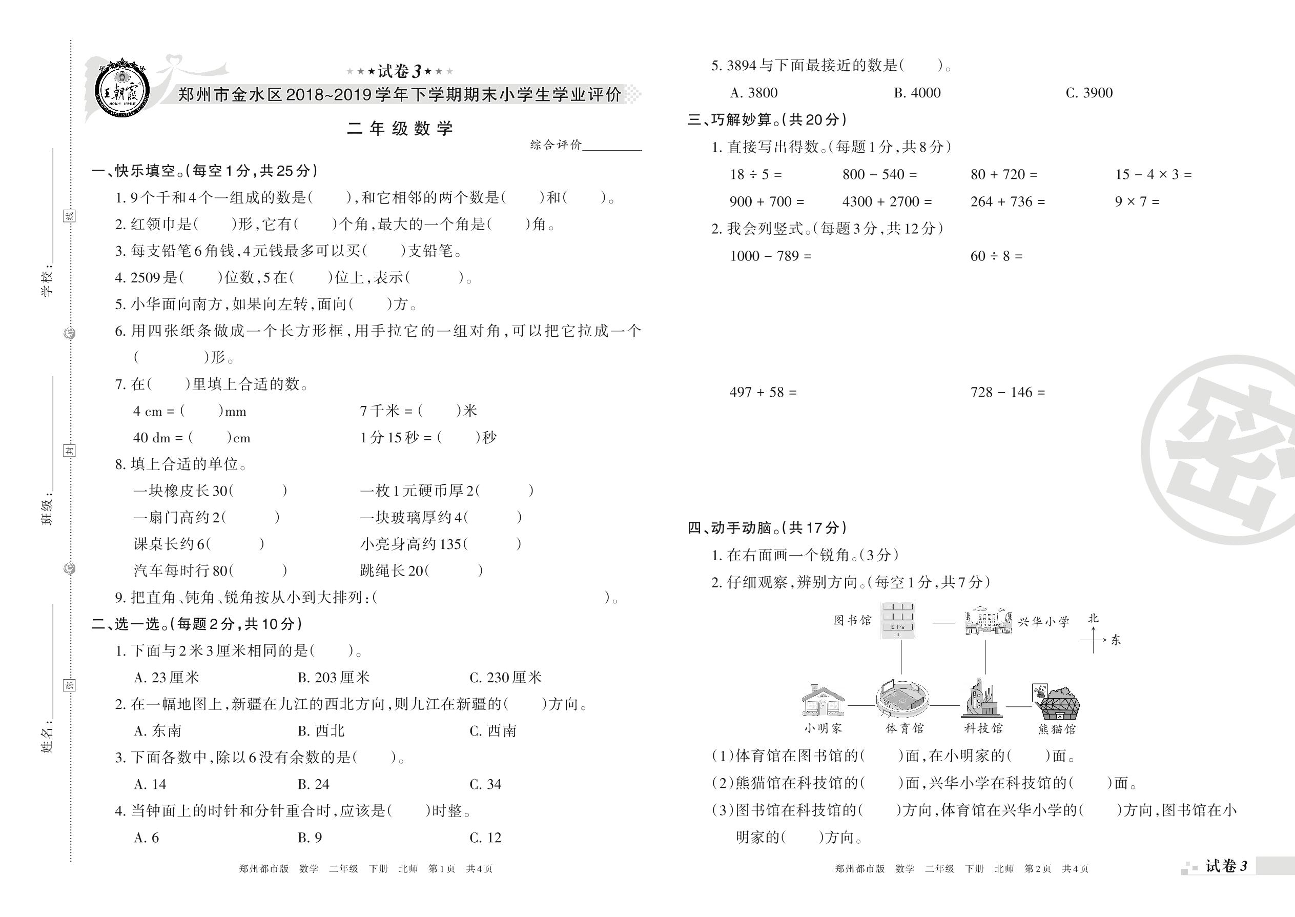 2018-2019学年第二学期郑州市金水区二年级数学试卷(北师版)【3】
