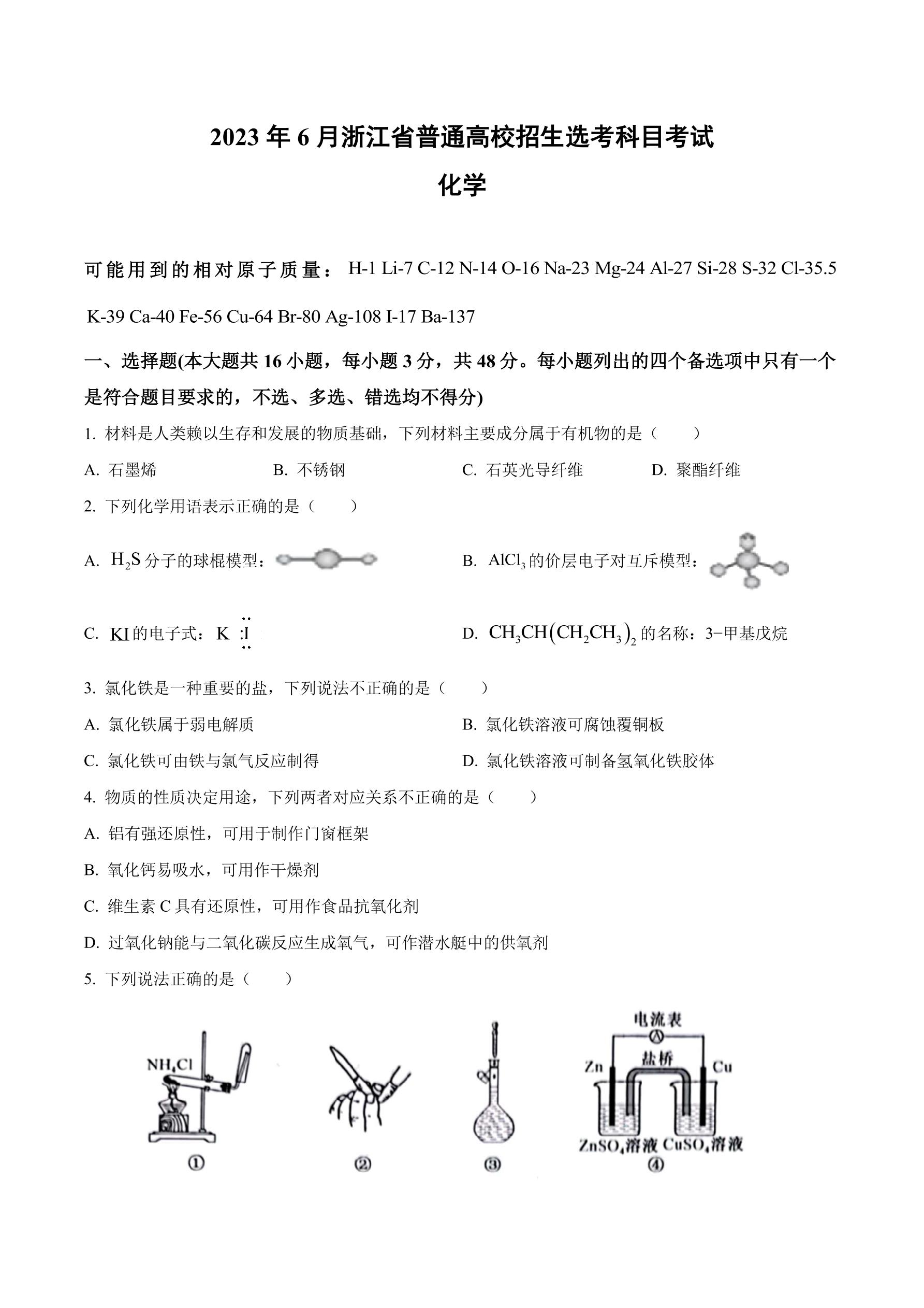 2023年高考浙江卷6月-化学