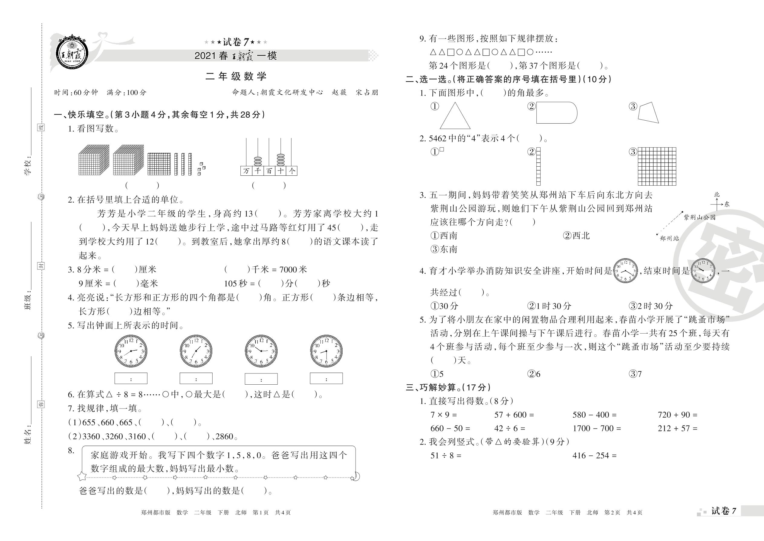 王朝霞期末模拟卷二年级下册数学(北师版)_R21080382235【7】