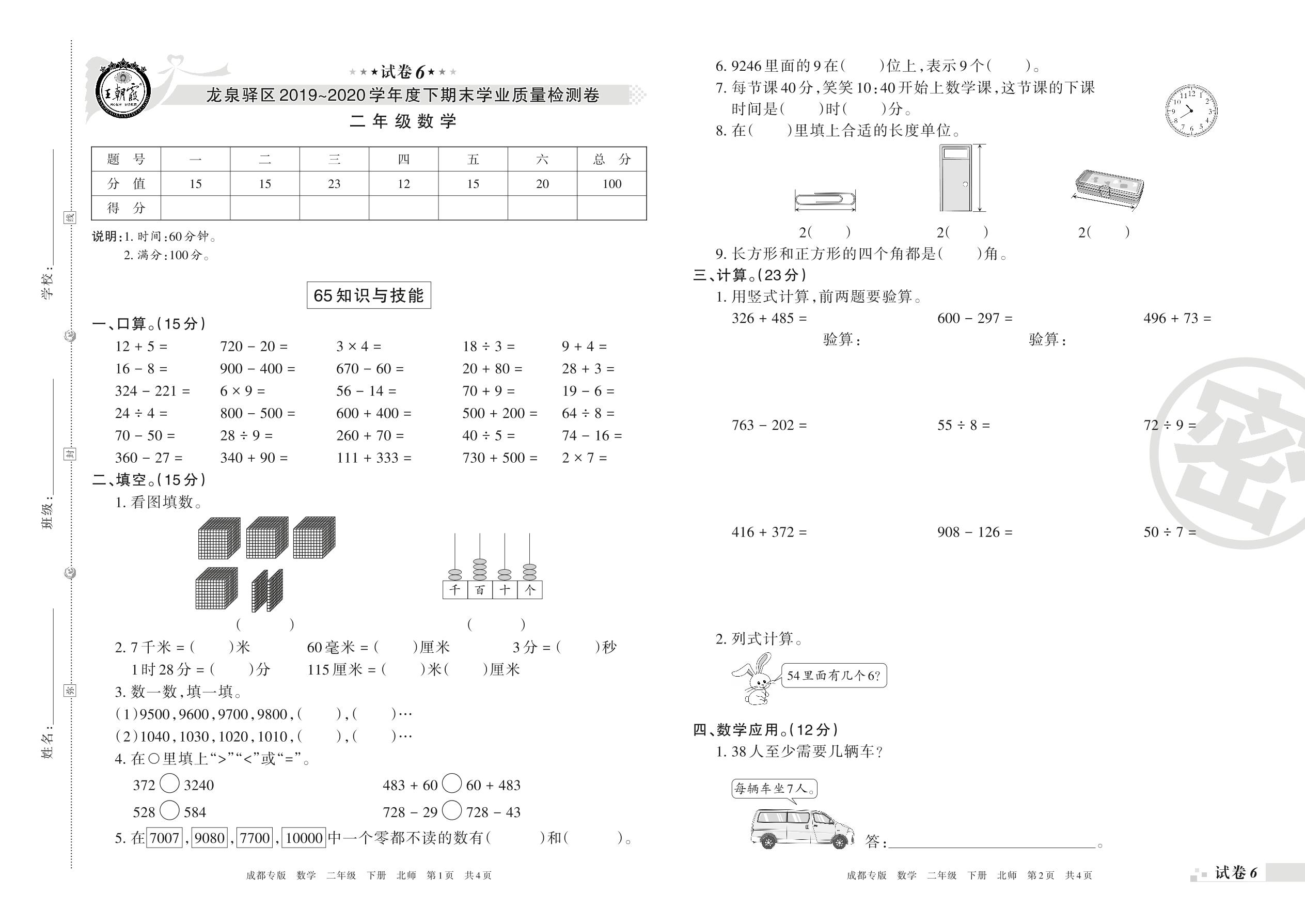 2019-2020学年第二学期成都市龙泉驿区二年级数学试卷(北师版)【6】