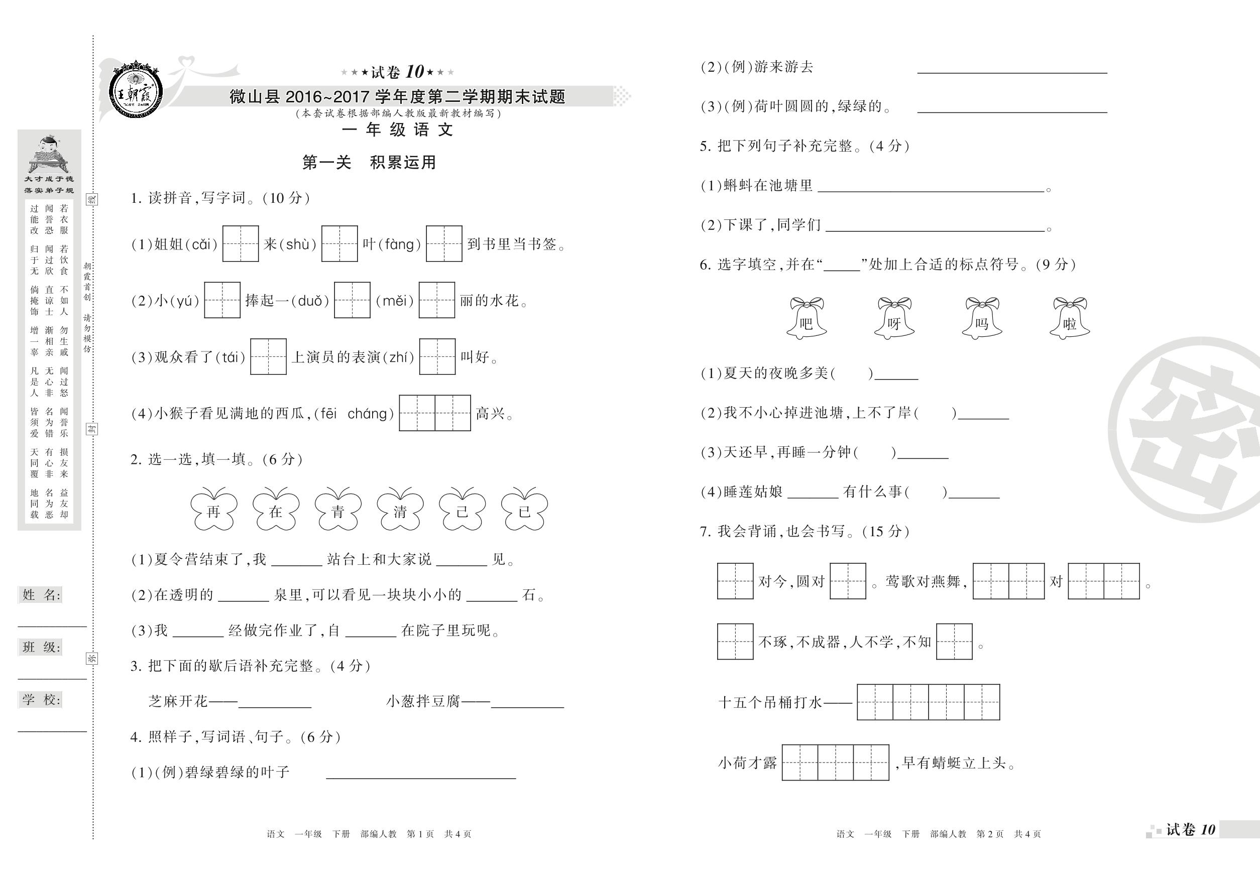 一年级语文人教版下册期末卷