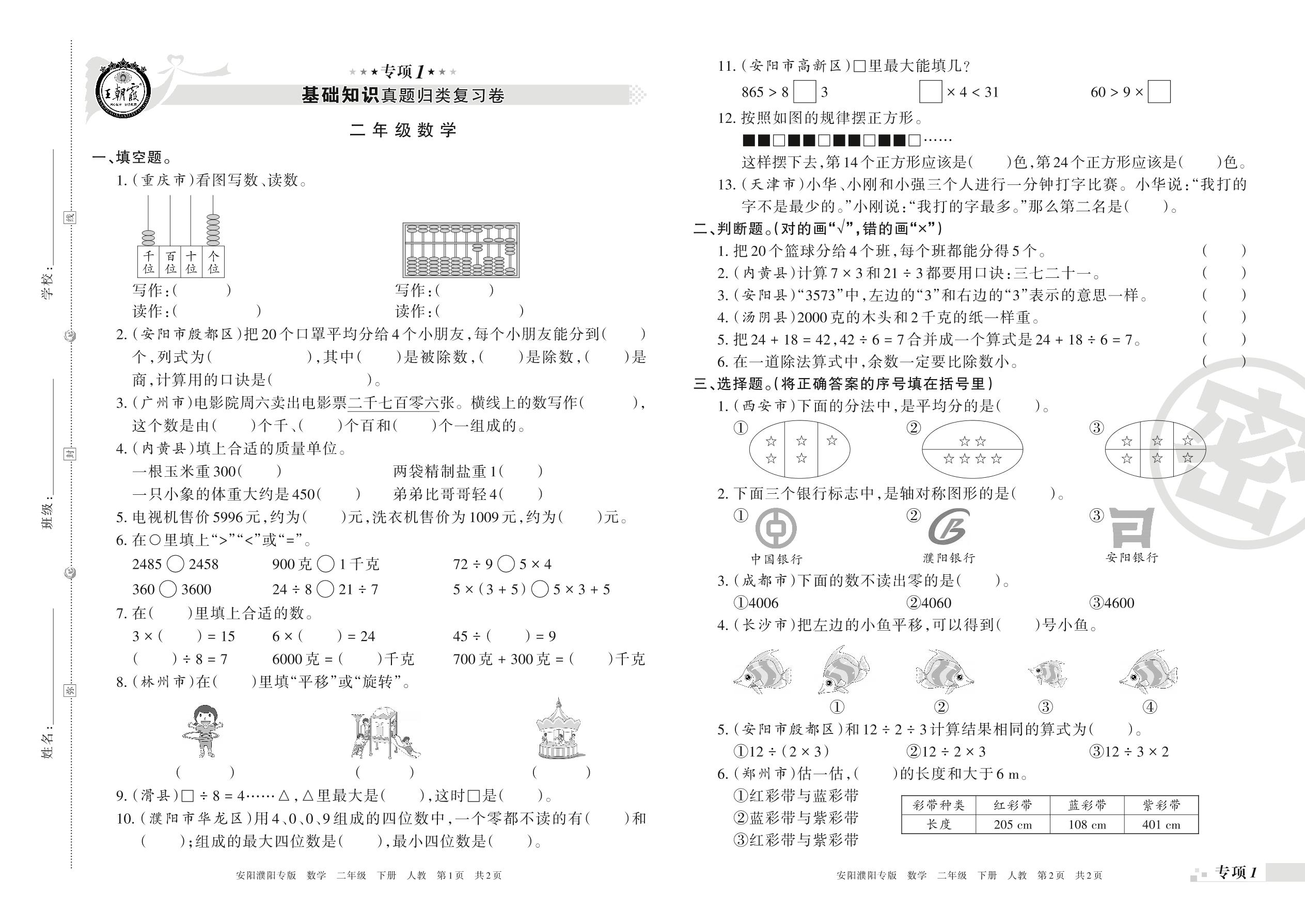 王朝霞期末专项卷——基础知识、计算真题归类复习二年级下册数学(人教版)_R21080382358【0】