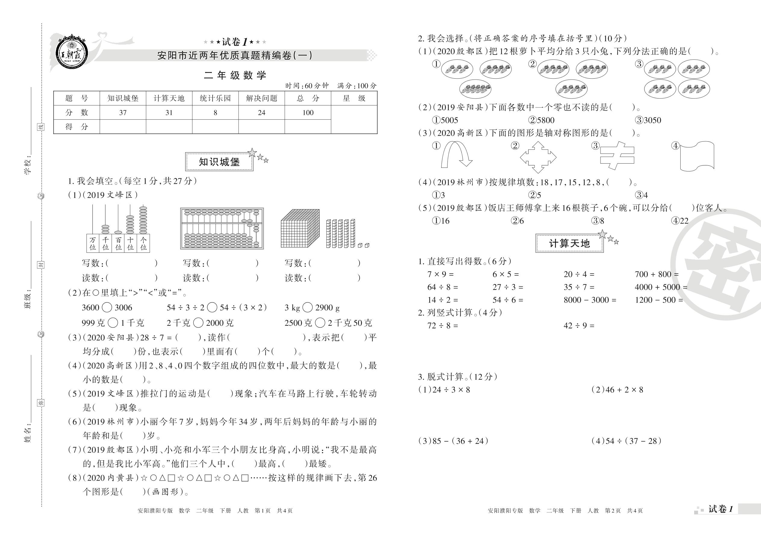 安阳市近两年优质真题精编卷(一)二年级下册数学(人教版)【1】