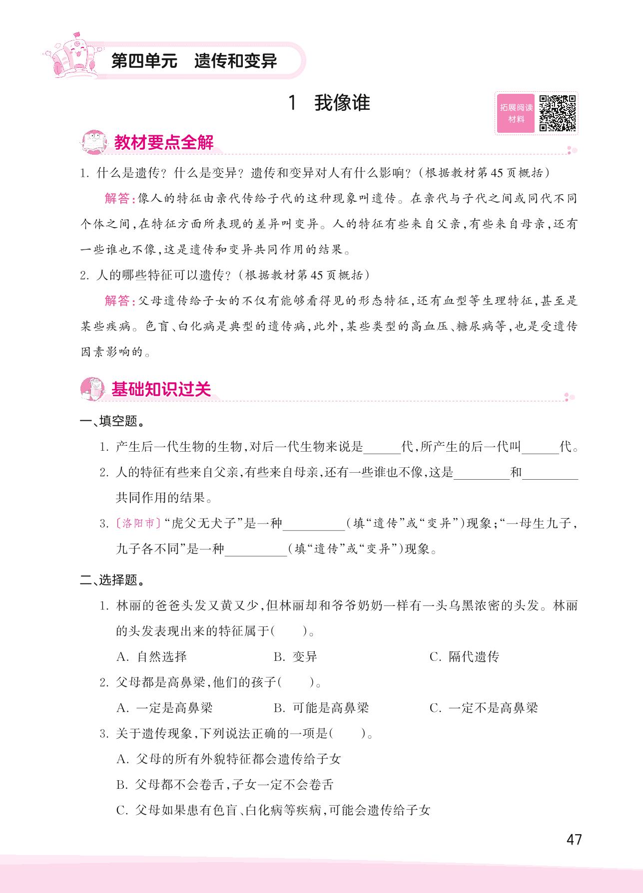 2023上册六年级科学大象版 第四单元 遗传和变异——1 我像谁