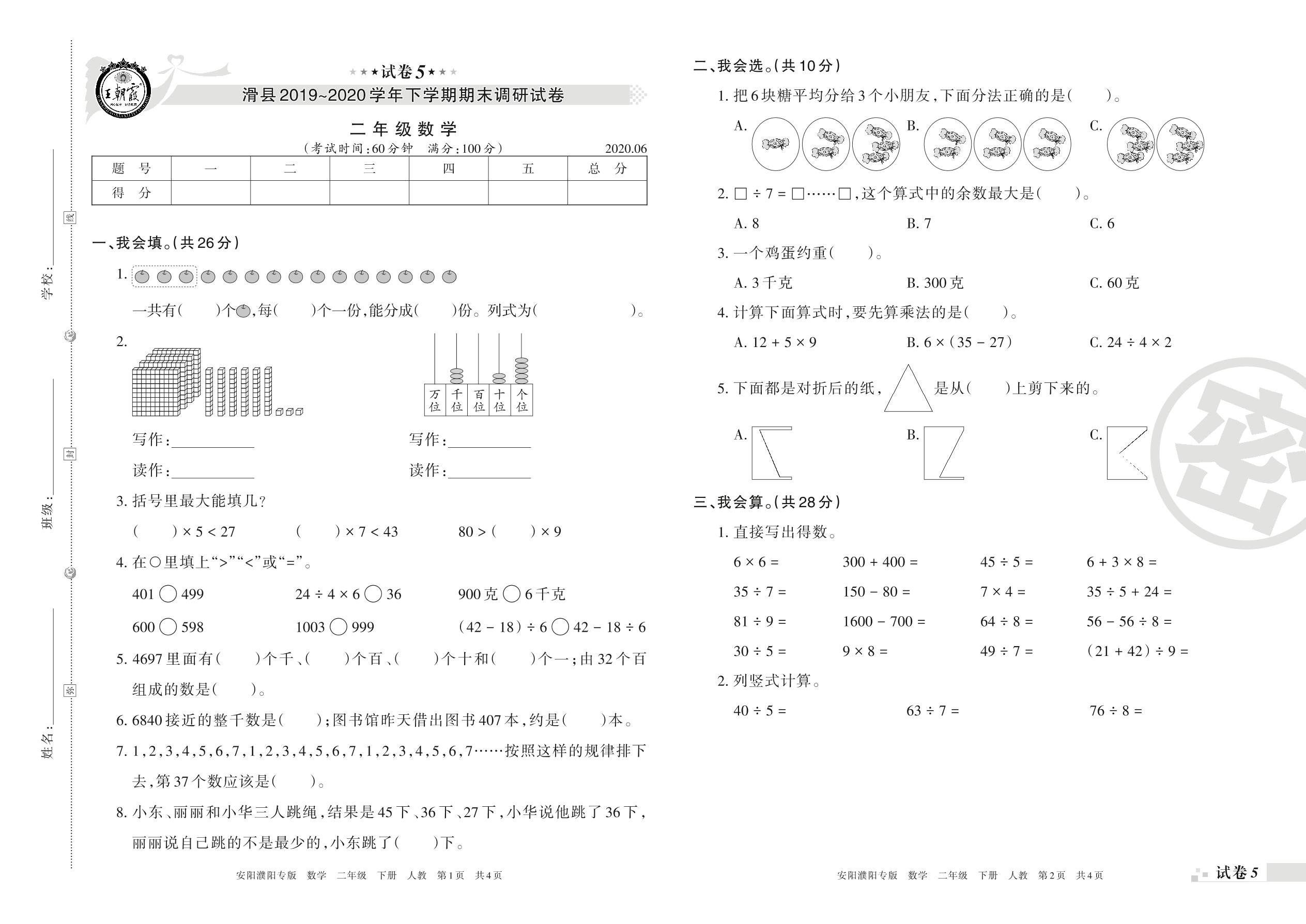 2019-2020学年第二学期安阳市滑县二年级数学试卷(人教版)【5】