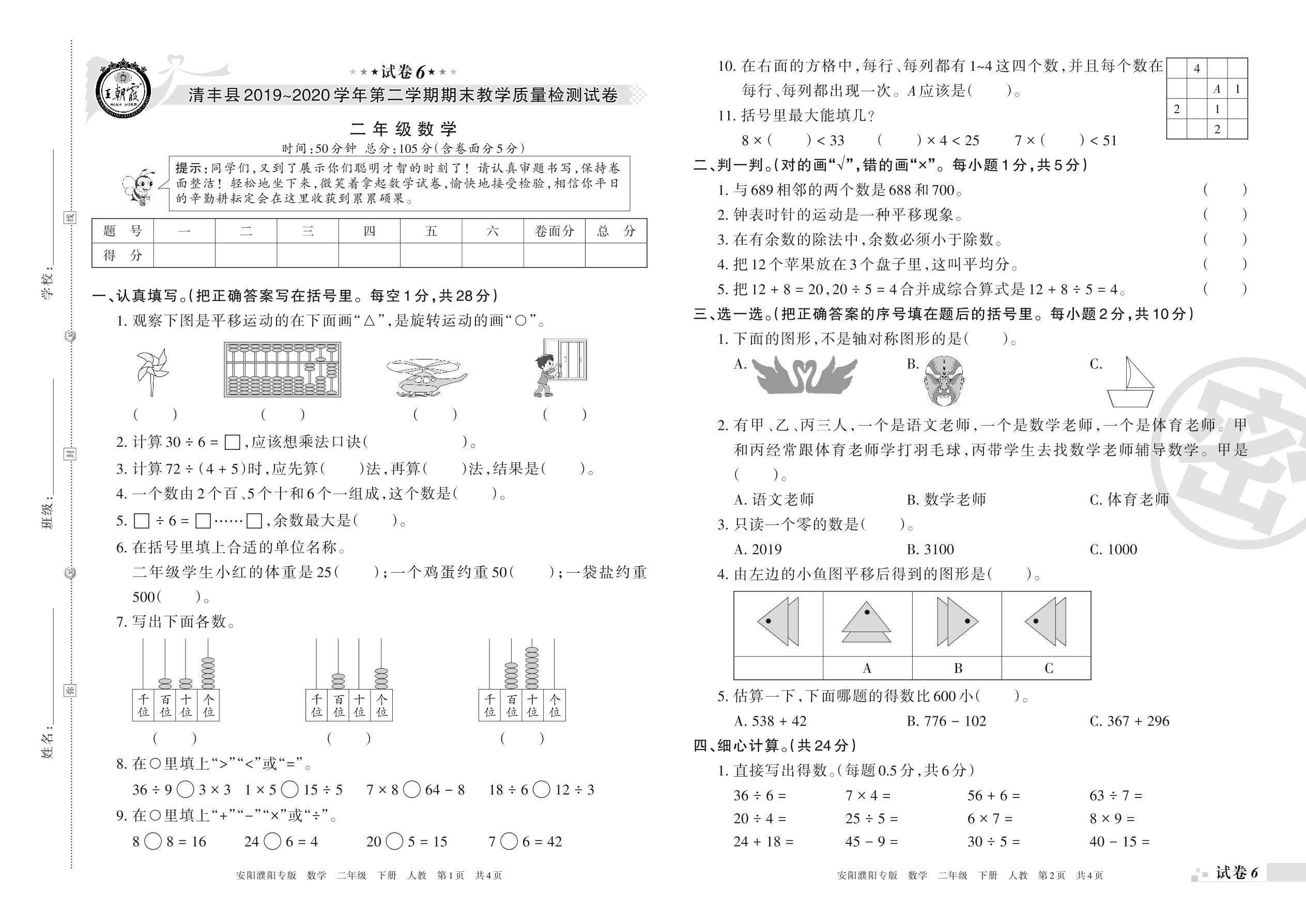 2019-2020学年第二学期濮阳市清丰县二年级数学试卷(人教版)【6】