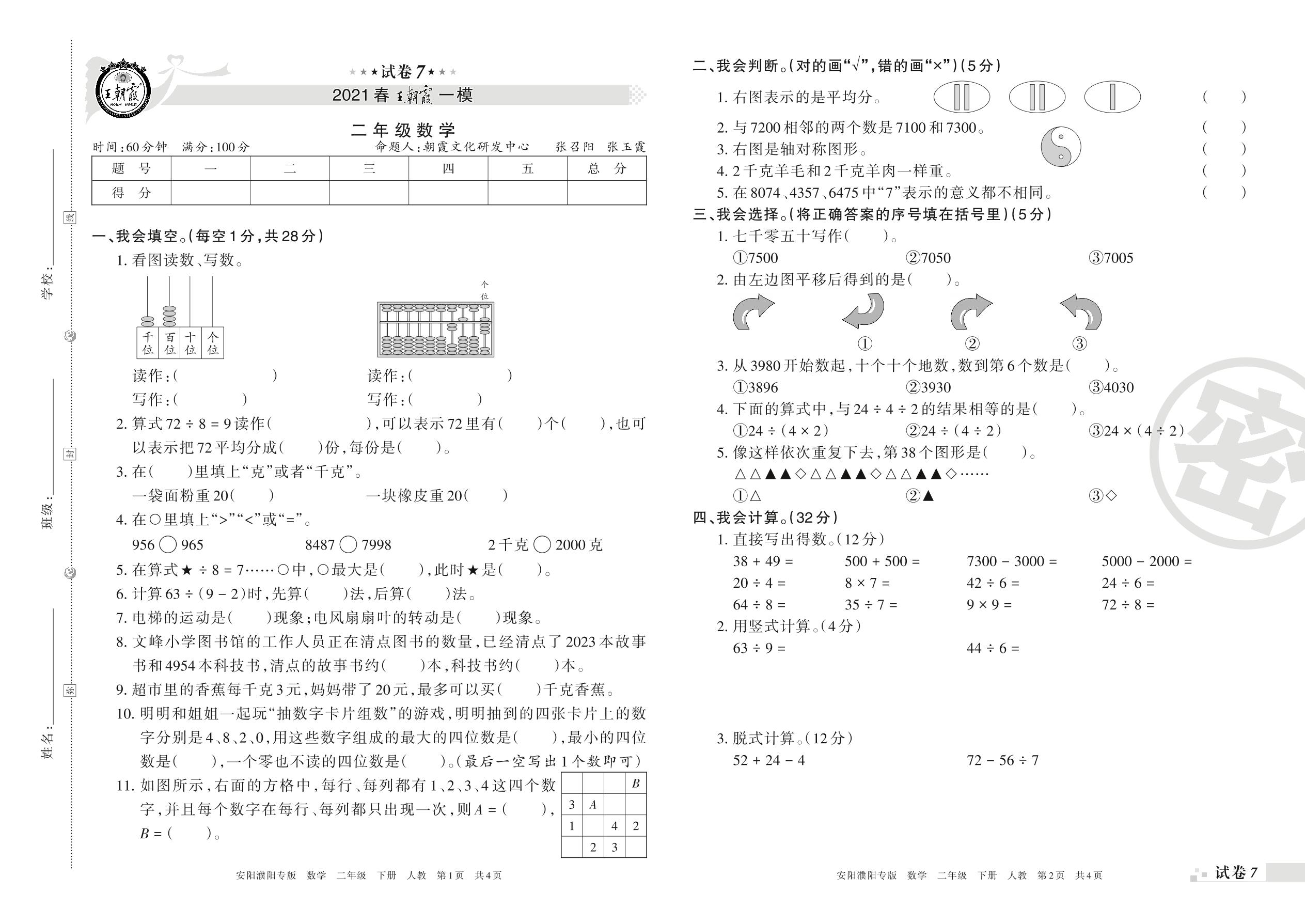王朝霞期末模拟卷二年级下册数学(人教版)_R21080382428【7】