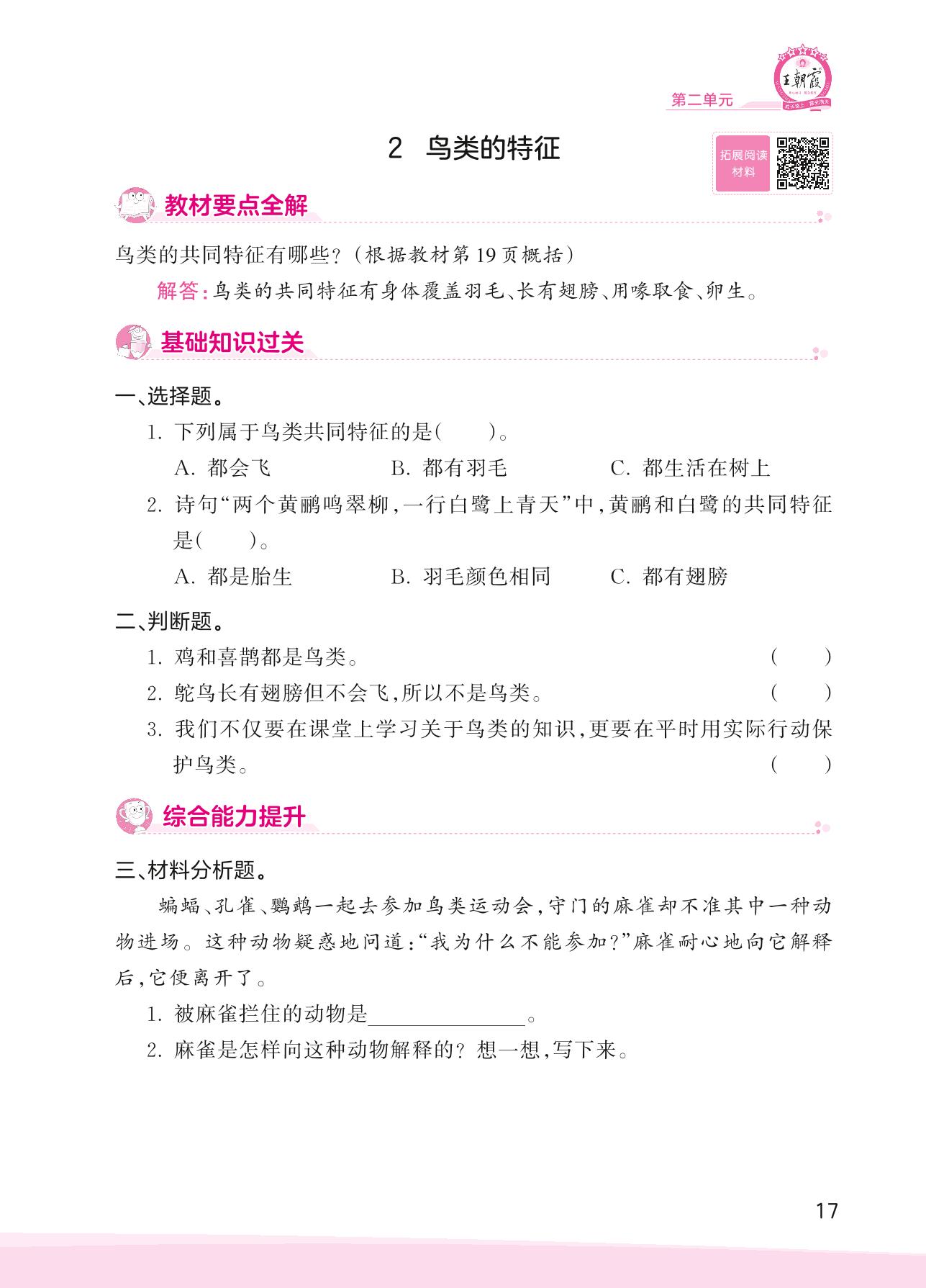 2023上册三年级科学大象版 第二单元 动物的特征——2 鸟类的特征