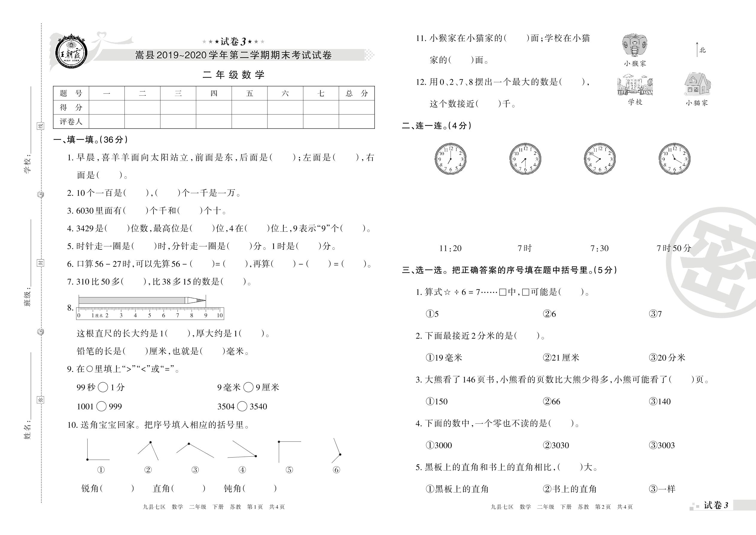 2019-2020学年第二学期洛阳市嵩县二年级数学试卷(苏教版)【3】